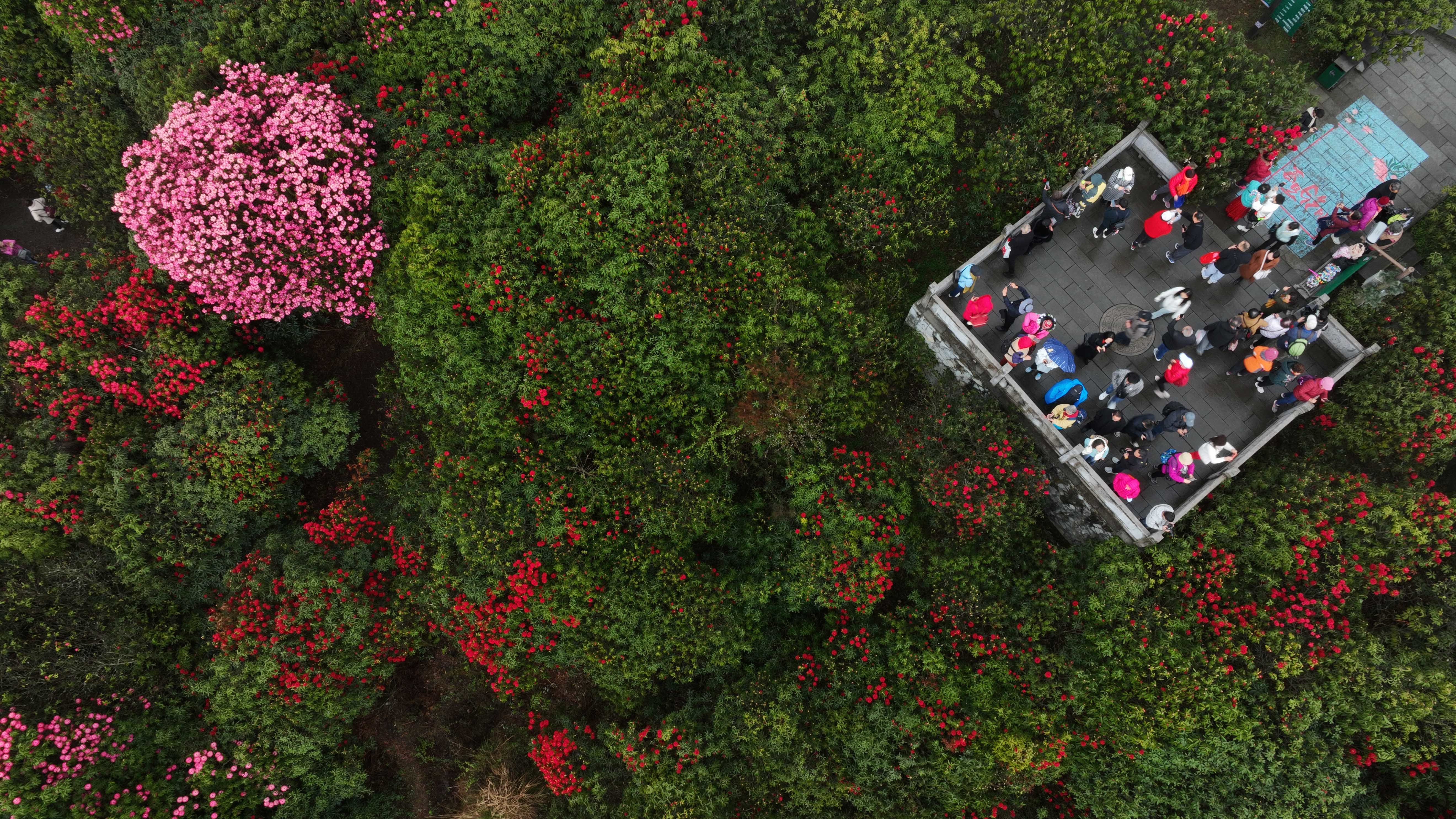 3月28日,游客在贵州省毕节市百里杜鹃风景区赏花(无人机照片)。新华社记者 杨楹 摄