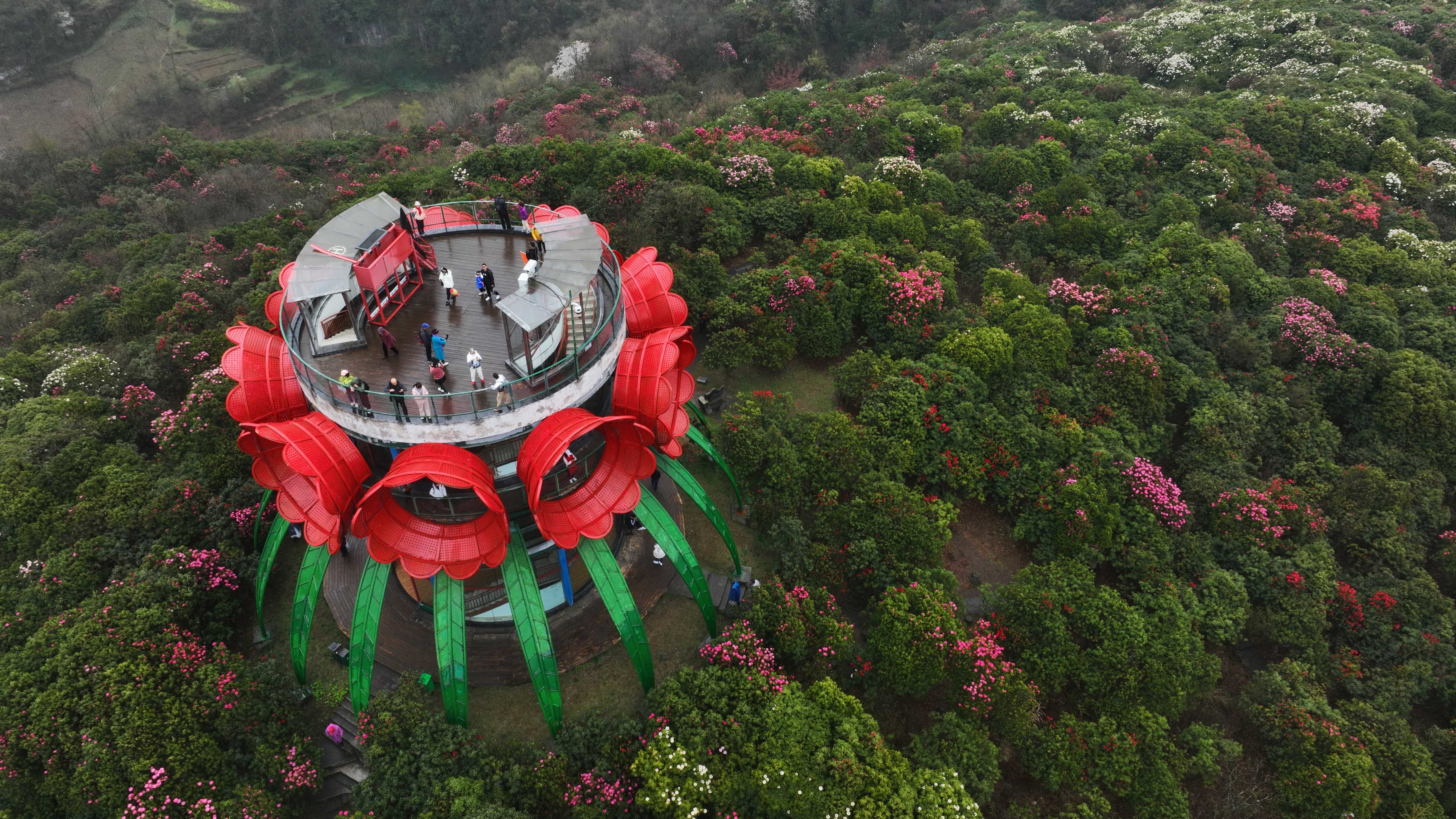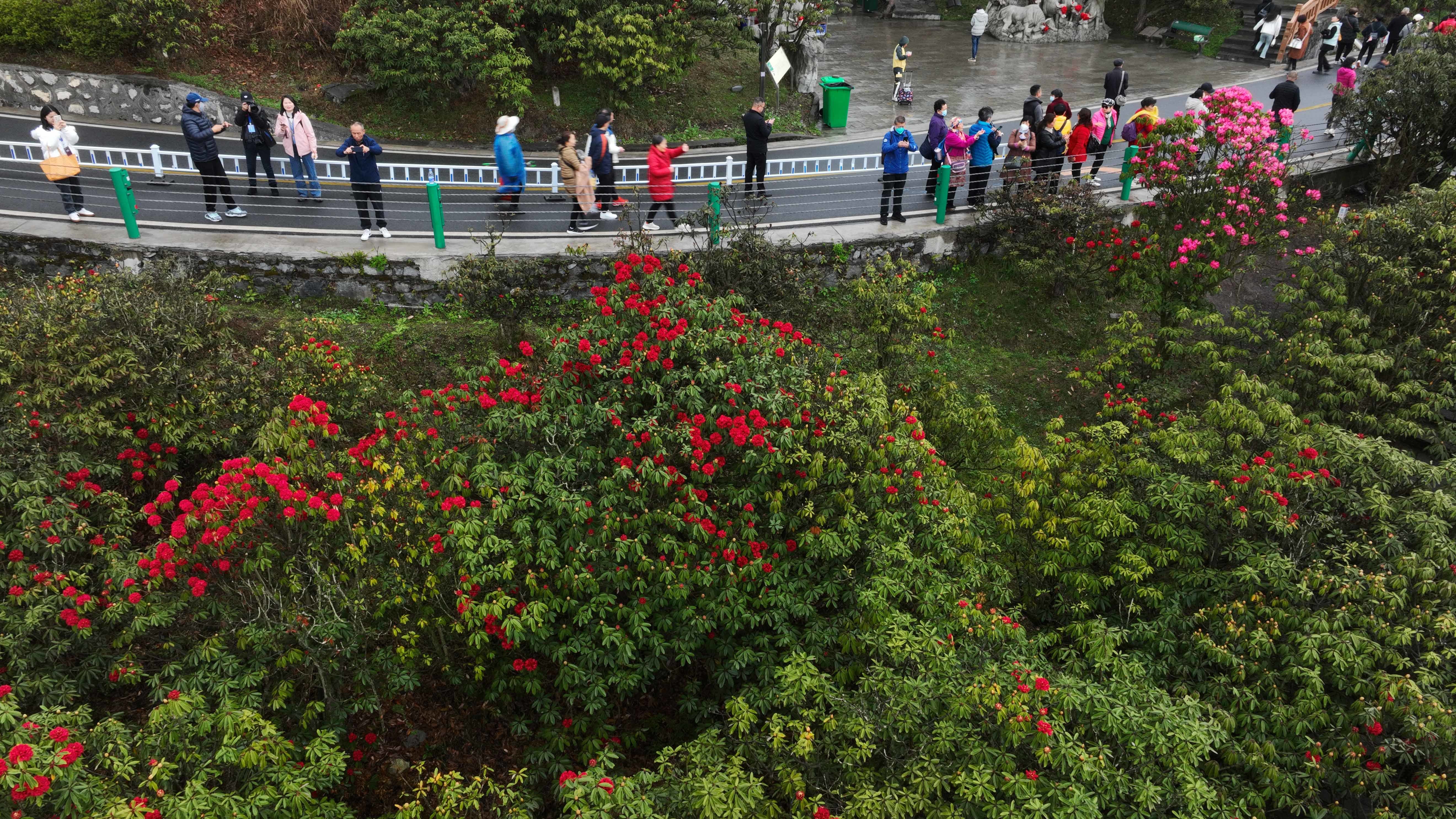 3月28日,游客在百里杜鹃景区醉九牛景点附近拍照(无人机照片)。新华社记者 刘续 摄