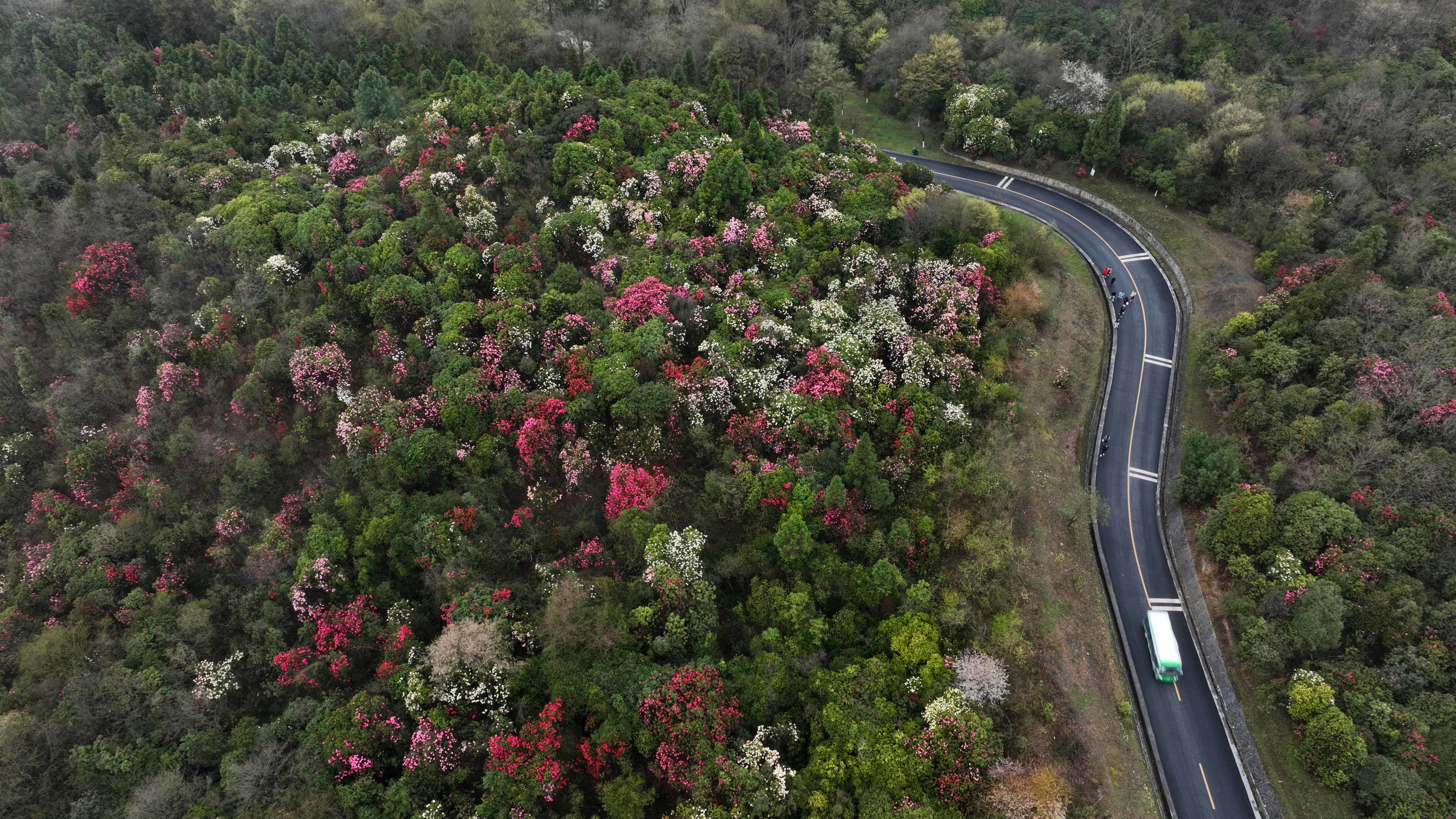 3月28日,百里杜鹃景区醉九牛景点附近杜鹃花盛开(无人机照片)。新华社记者 刘续 摄