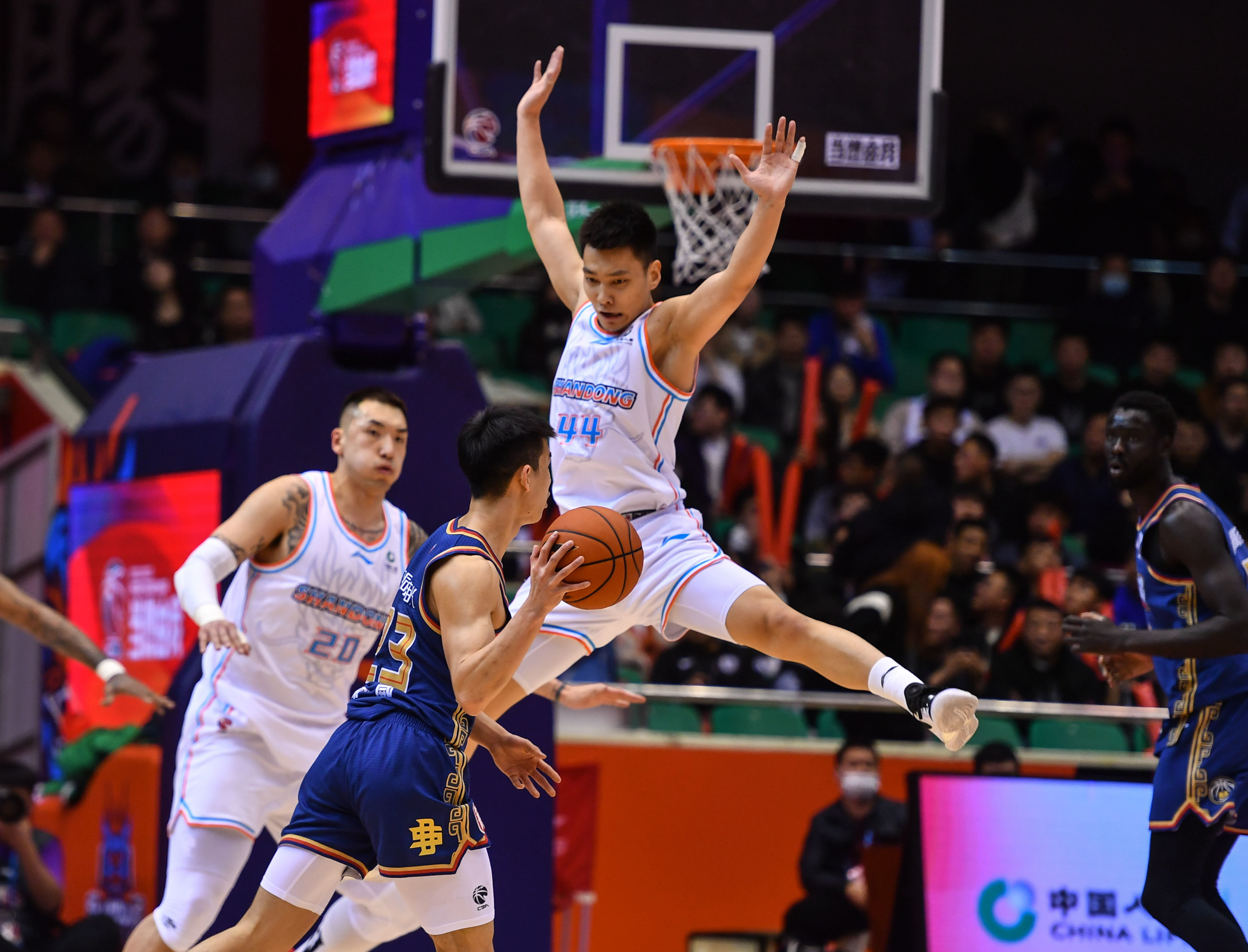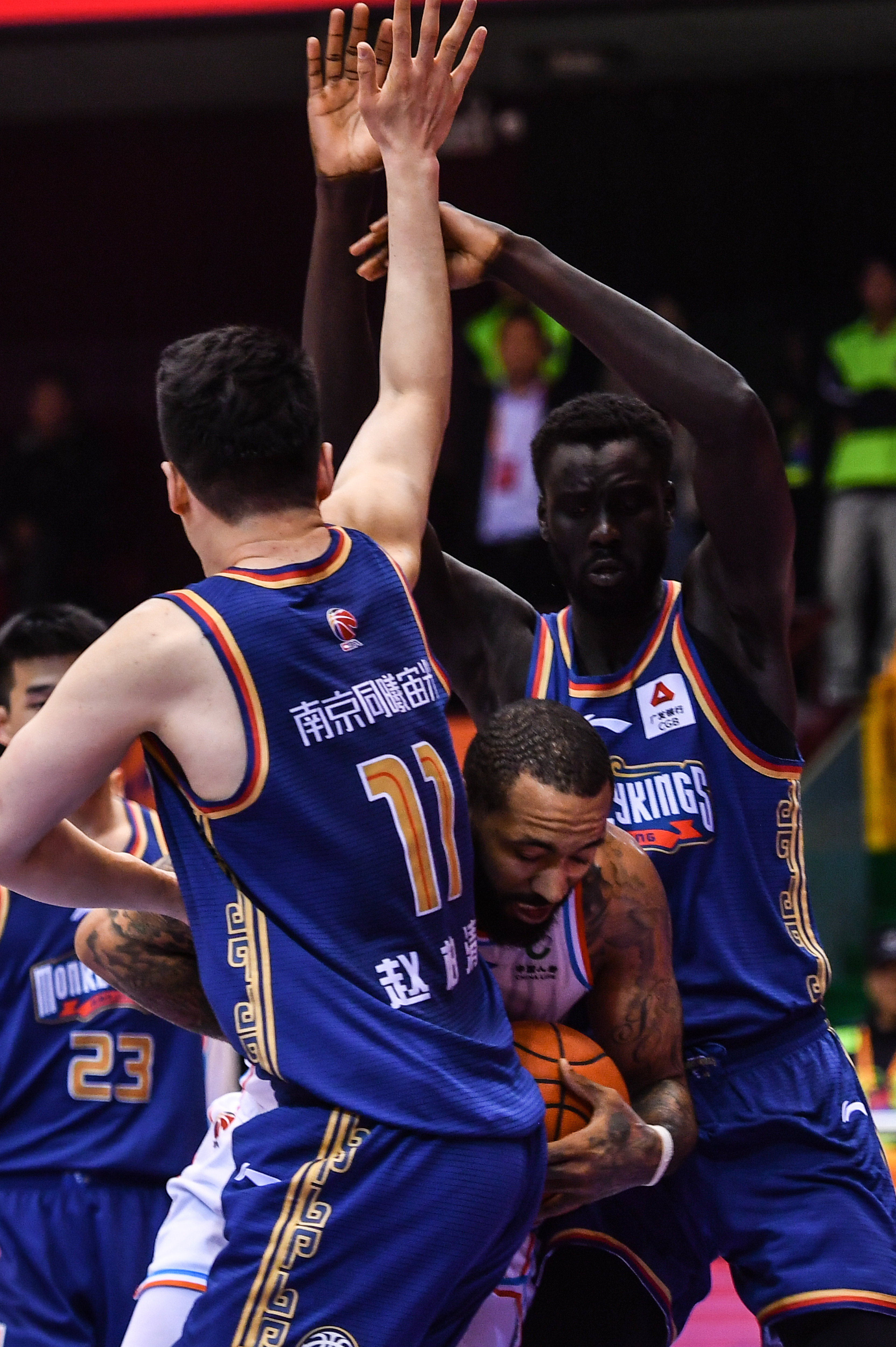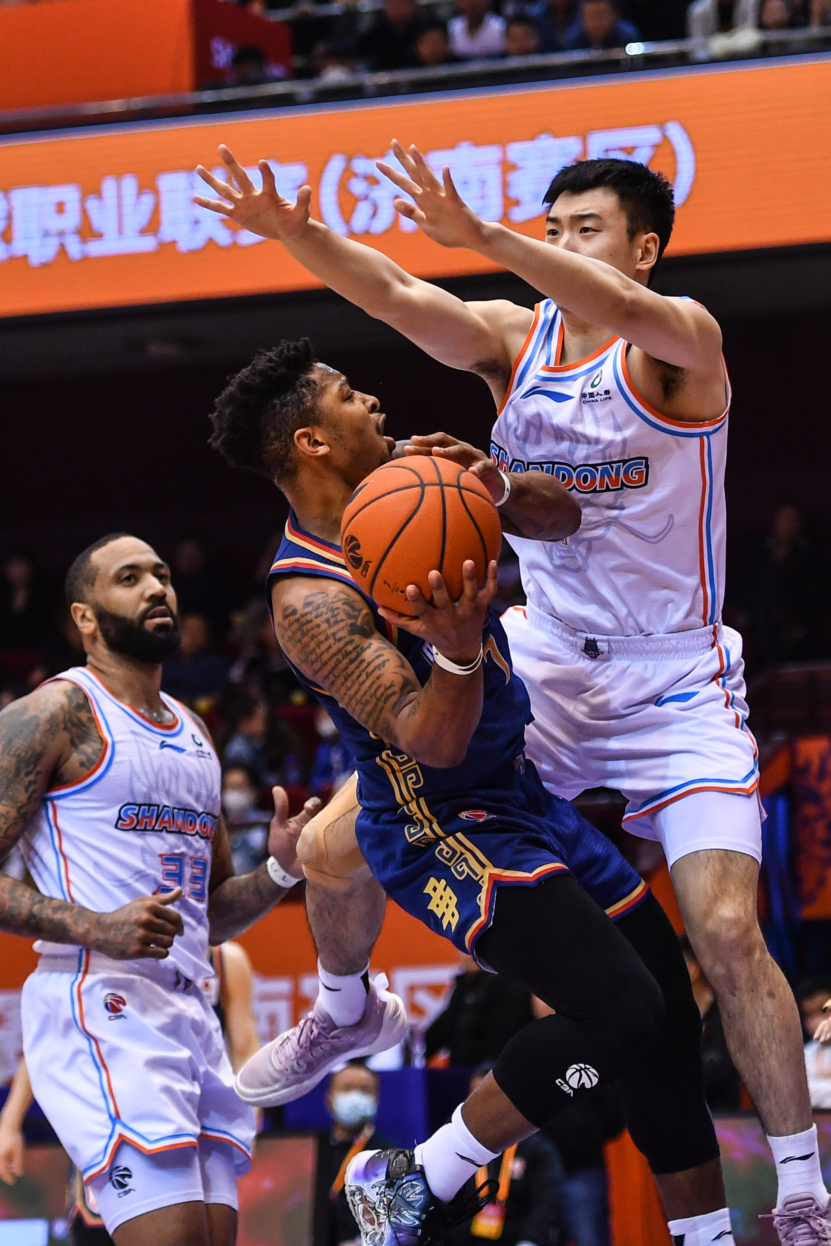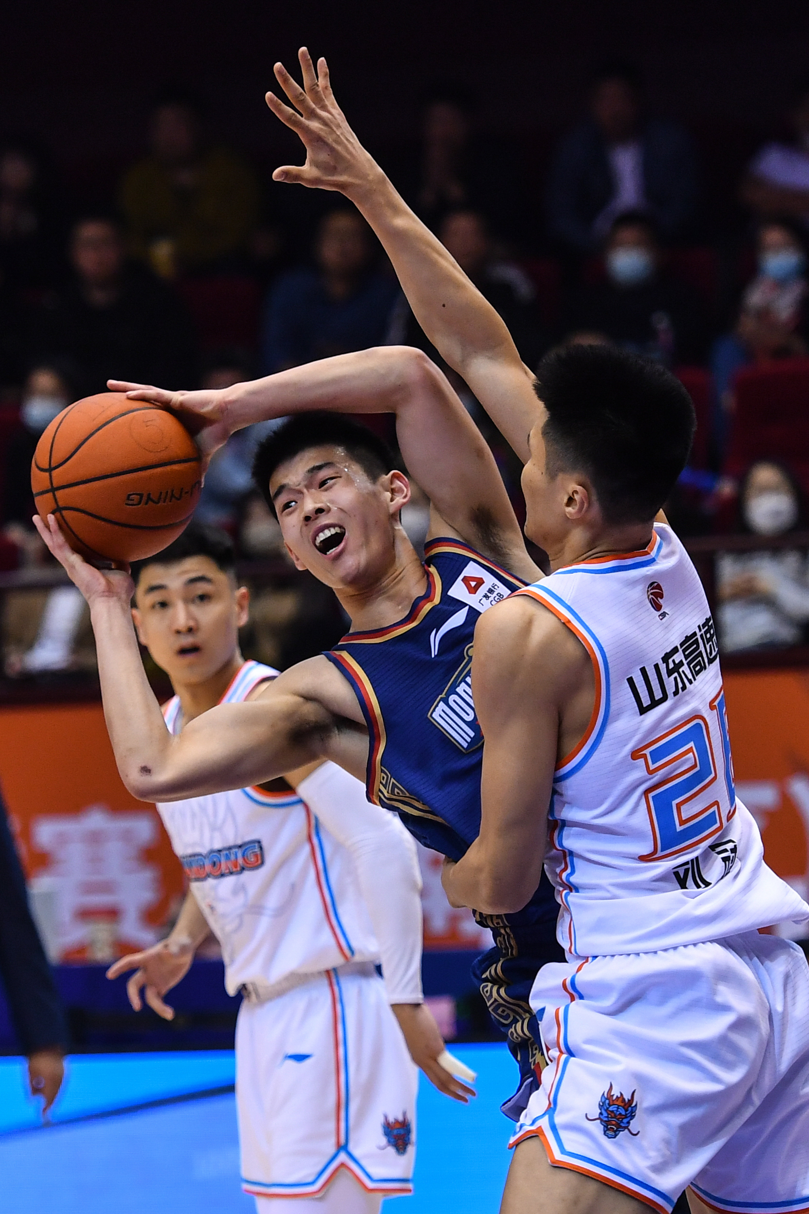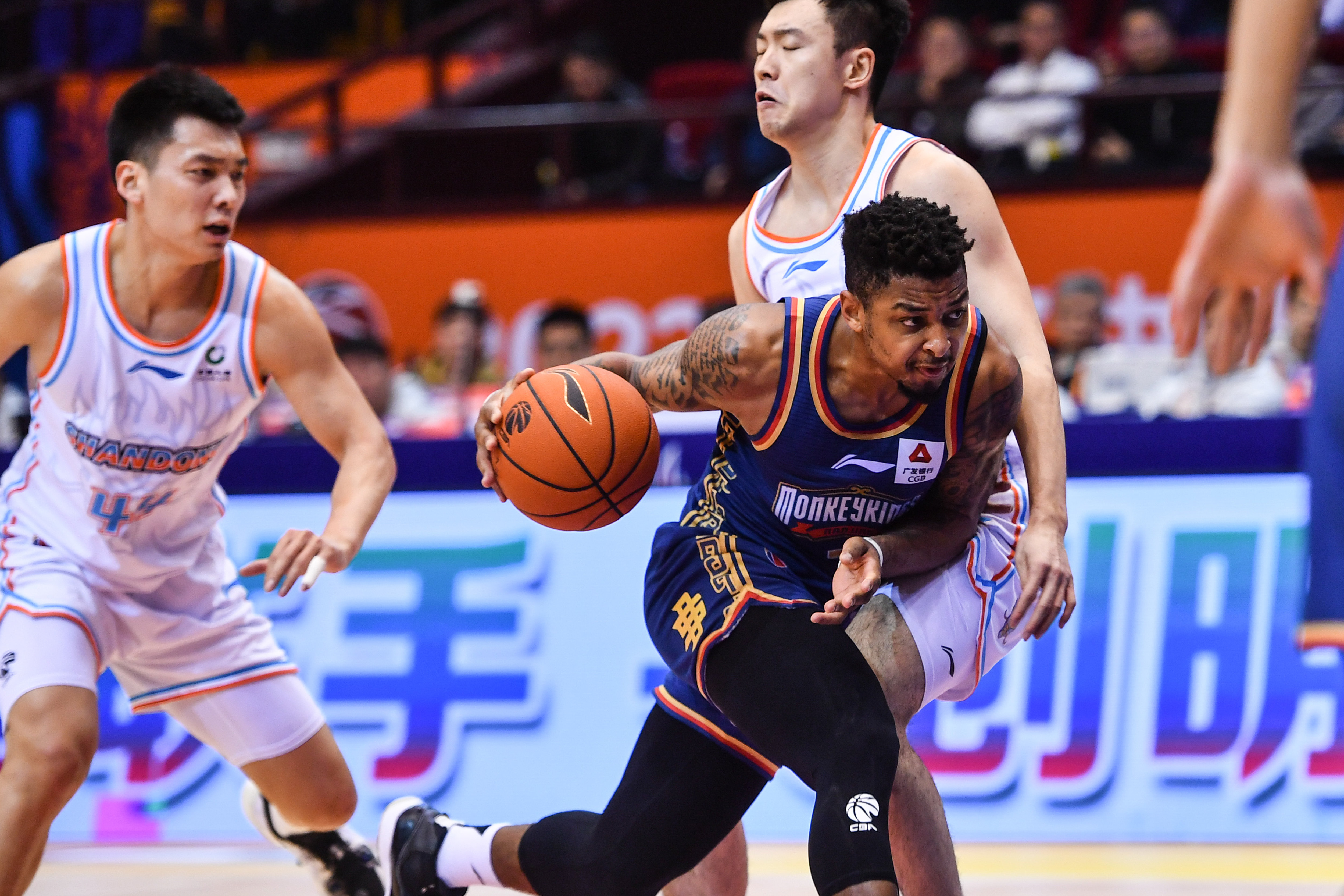 3月28日,山东高速队球员吉伦沃特(中)在比赛中突破受阻。新华社记者 朱峥 摄