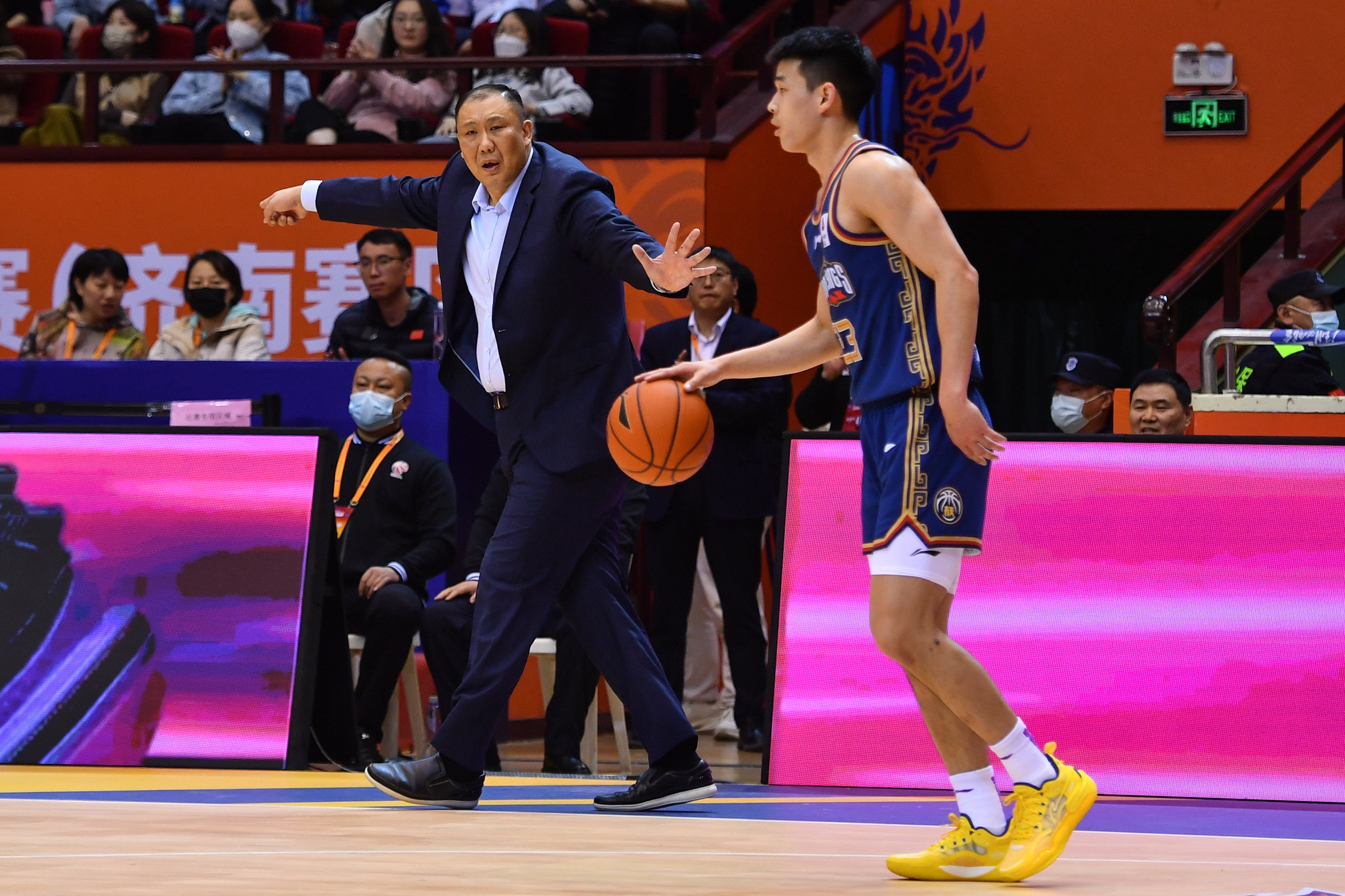 3月28日,山东高速队主教练王晗(左)在场边指挥。新华社记者 朱峥 摄