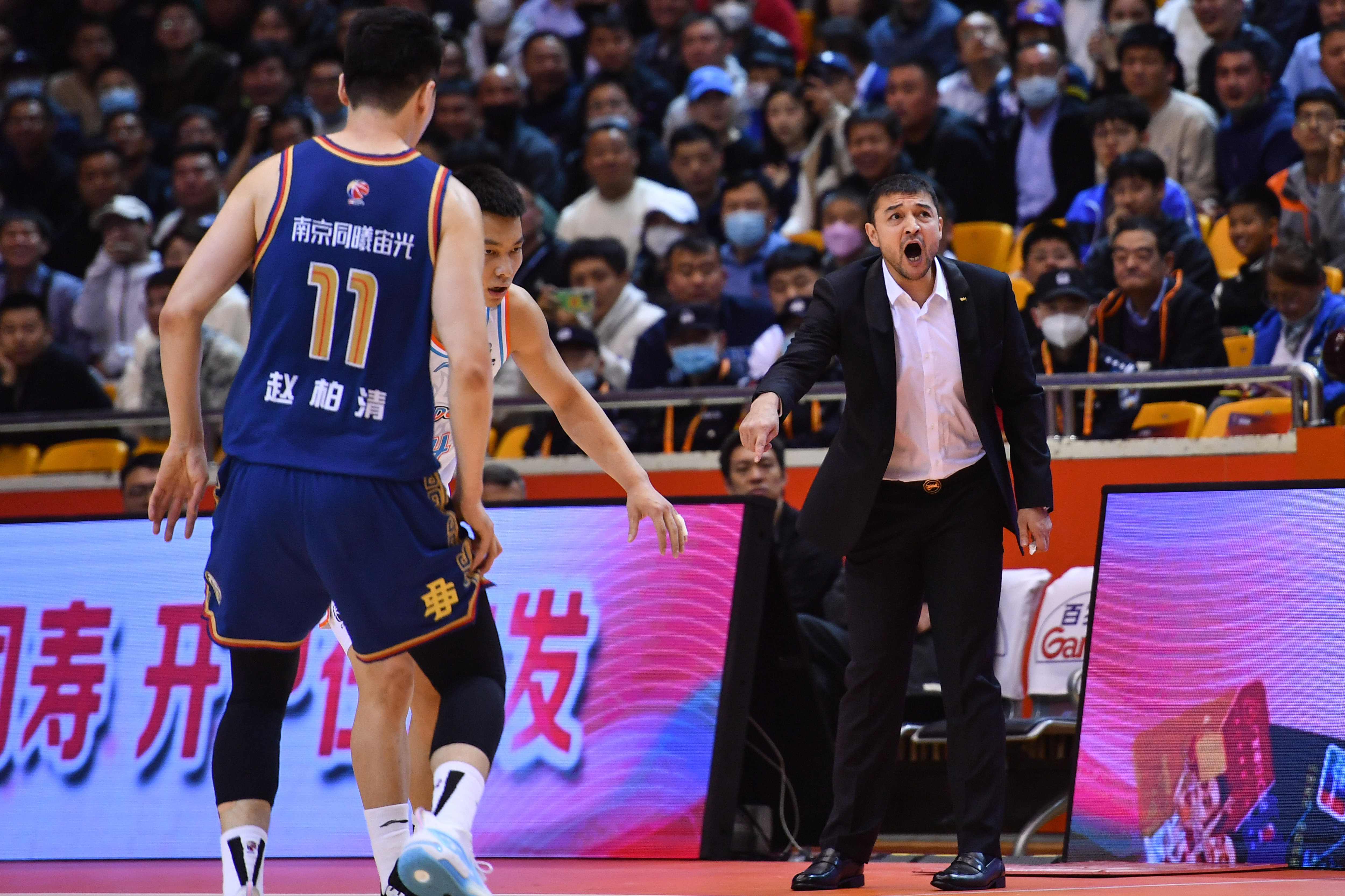 3月28日,南京同曦宙光队主教练西热力江(右)在比赛中。新华社记者 朱峥 摄