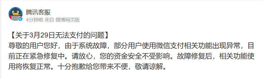 据第一财经3月29日消息,腾讯客服官博称,由于系统故障,部分用户使用微信支付相关功能出现异常,目前正在紧急修复中。用户资金安全不受影响。故障修复后,相关功能使用将恢复正常。