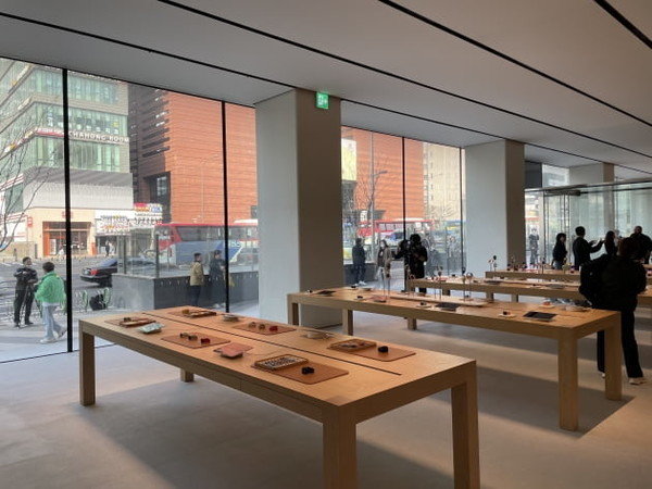 3月29日上午,苹果在开业前两天的媒体预览活动中提前揭开了Apple Gangnam的面纱。在零售店的入口处,苹果采用了十分罕见的彩色装饰来吸引年轻人的眼球,并应用了Apple标志玻璃立面,店内则放置了由当地材料制成的木墙、桌子和地板。苹果官方解释称:“门店外部立面加入了镜面镀膜工艺,所以看起来从上到下是无缝连接的。”消费者可以在这里体验苹果旗下的最新产品和各种服务,包括Apple Music和AppleTV Plus。