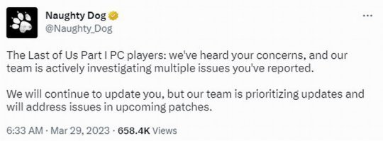 今日顽皮狗官方在推特上发文回应,表示已知晓《最后的生还者》PC版目前的情况,团队正在积极调查玩家报告的多个问题。未来官方将继续提供更新,但会优先解决这些问题,将发布更新补丁解决。