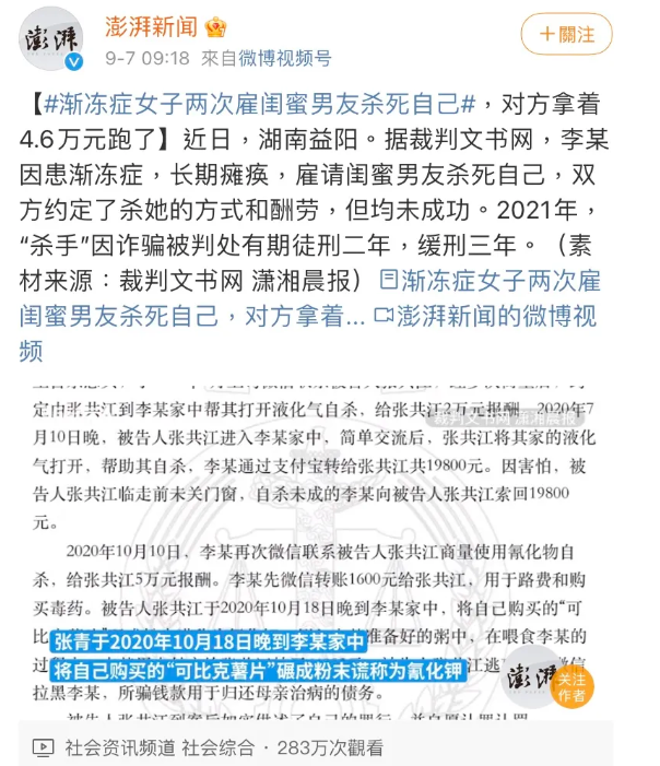 屡次帮她“自杀”的“杀手们”全部入狱判刑。