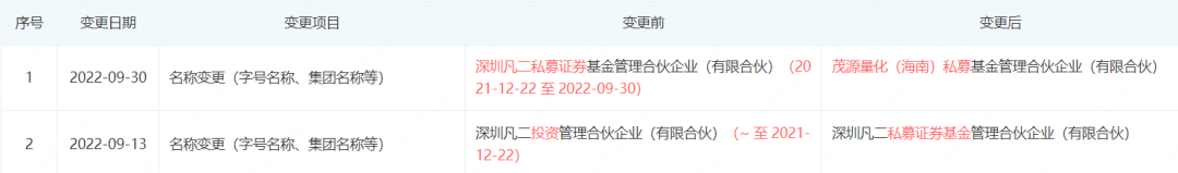 从工商信息来看,“茂源量化”这个名字启用,并没有太久。在2013年3月成立之际,其名字先是深圳凡二投资管理合伙企业(有限合伙,下称“凡二投资”);2021年12月更名为深圳凡二私募证券基金管理合伙企业(有限合伙,下称“凡二私募”);直到2022年9月刚刚更名为茂源私募。