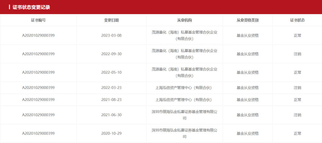 中基协从业人员信息显示,FRANK CHEN于2020年10月起首次登记执业于深圳市丽海弘金私募证券基金管理有限公司(简称:丽海弘金私募),2021年8月起任职于上海泓倍资产管理中心(有限合伙)(简称:泓倍资产),2022年5月登记于茂源量化。