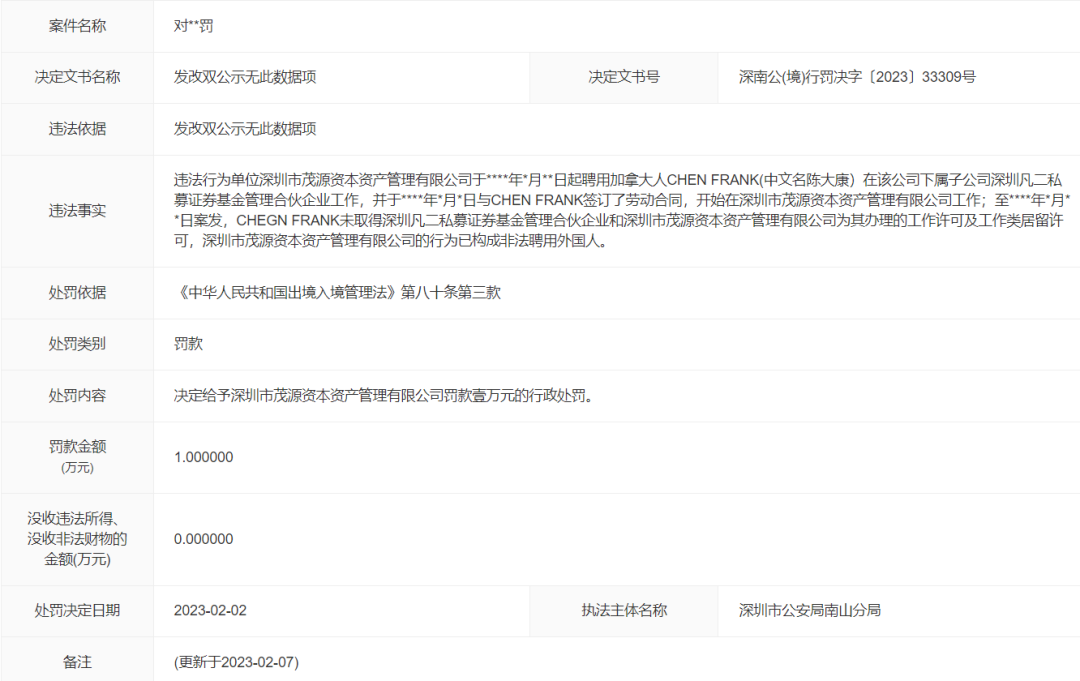 茂源资本资产管理有限公司于****年*月**日起聘用加拿大人CHEN FRANK(中文名陈大康)在该公司下属子公司深圳凡二私募证券基金管理合伙企业工作,并于****年*月*日与CHEN FRANK签订了劳动合同,开始在深圳市茂源资本资产管理有限公司工作;至****年*月**日案发,CHEN FRANK未取得凡二私募和茂源资本为其办理的工作许可及工作类居留许可,这一行为已构成非法聘用外国人。
