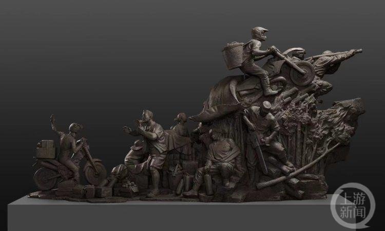 在四川美术学院雕塑系,这座《缙云之巅》雕塑已经完整地呈现在大家面前,作品长2.65米,宽0.9米,高1.3米。雕塑正面底部由大量山石组合而成、上部由消防官兵、摩托骑士、志愿者等构成群雕。雕塑背面由油锯手、休息的消防官兵和喊话的志愿者等组成。12个主体人物栩栩如生,再现了消防官兵、武警战士、摩托骑士及广大人民群众志愿者众志成城、团结一心、攻坚克难、战胜山火保卫缙云山的英勇场面。