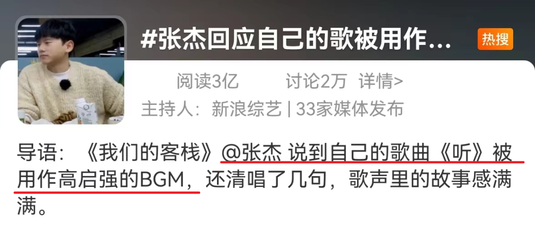 某日,“张杰回应自己的歌被用作狂飙高启强BGM”话题一度登顶热搜榜。
