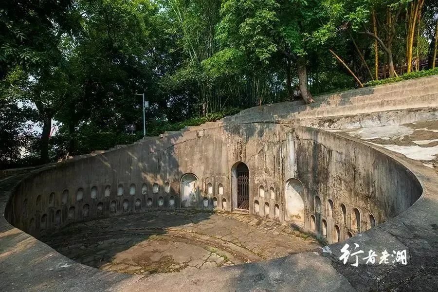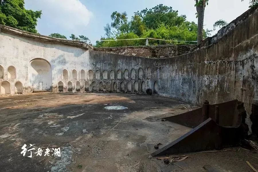 威远炮台旧址,像是一条360米长的露天战壕,左边堡垒防卫墙壁和清兵营房,右边是一排对着珠江水面的暗台炮台。26座暗台呈月牙形伸向珠江口,炮洞为花岗岩砌成,炮口对着水面。炮洞里的弹药吸引眼球,光绪年间的前膛裝滑膛铁炮,两米三长的褐色炮身颇为震撼。