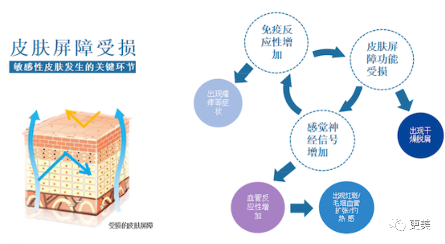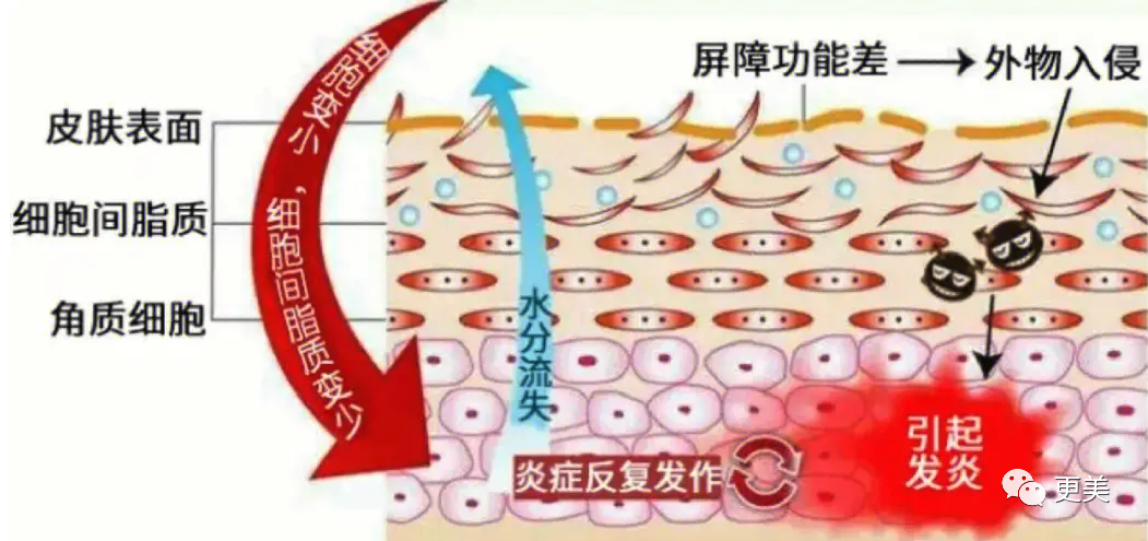 炎症对屏障的影响是连锁反应,屏障受损→表皮水分丢失→皮肤缩水性下降→皮肤干燥→紧绷甚至脱屑→影响角质层细胞生长→加剧皮肤衰老。