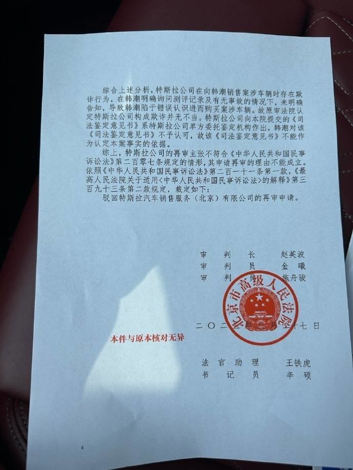 2023年3月27日,北京高院作出民事裁定书显示,该案二审被驳回上诉后,特斯拉不服判决,申请再审。北京高院综合各方证据分析后,认为特斯拉公司在向韩潮销售案涉车辆时存在欺诈行为,在韩潮明确询问测评记录及有无事故的情况下,未明确告知,导致韩潮陷于错误认识进而购买涉案车辆。故原审法院认定特斯拉公司构成欺诈并无不当。特斯拉公司提交的《司法鉴定意见书》 系特斯拉公司单方委托鉴定机构作出,韩潮对该 《司法鉴定意见书》不予认可,故该 《司法鉴定意见书》不能作为认定本案事实的依据。依照相关法律规定,北京高院驳回了特斯拉公司的再审申请。