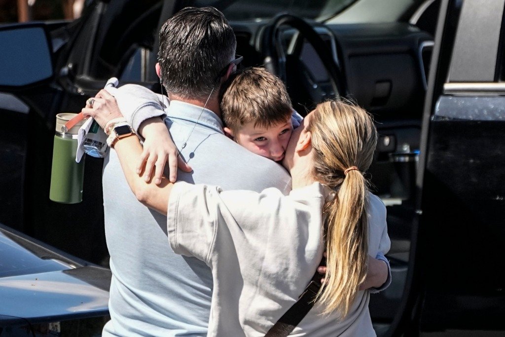 3月27日,在美国田纳西州纳什维尔市,家长拥抱经历枪击事件的孩子。新华社/美联