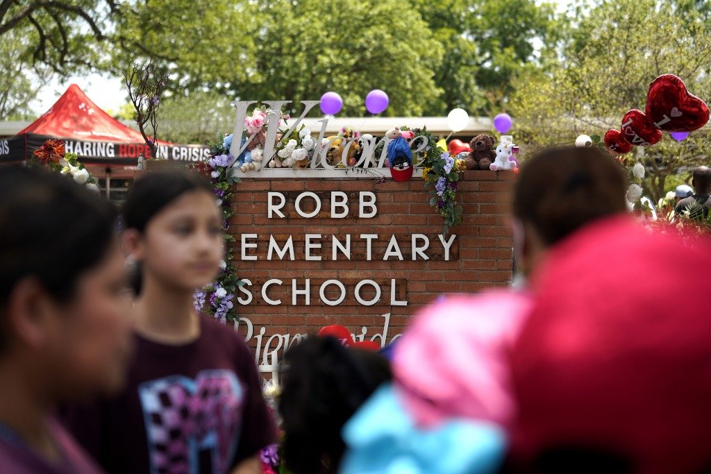2022年5月30日,在美国得克萨斯州南部尤瓦尔迪市发生枪击事件的小学,人们悼念遇害者。新华社记者吴晓凌摄