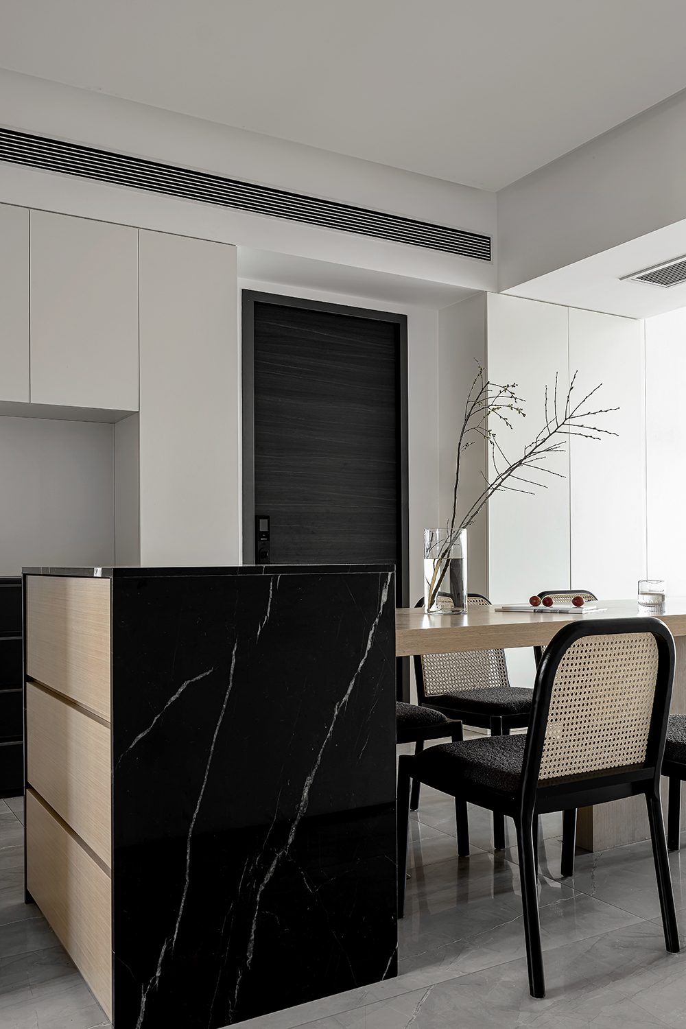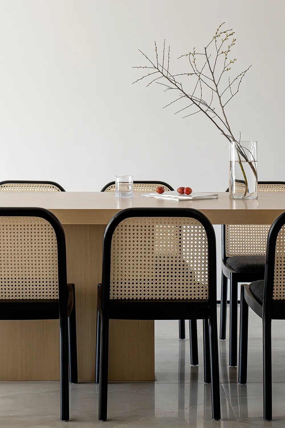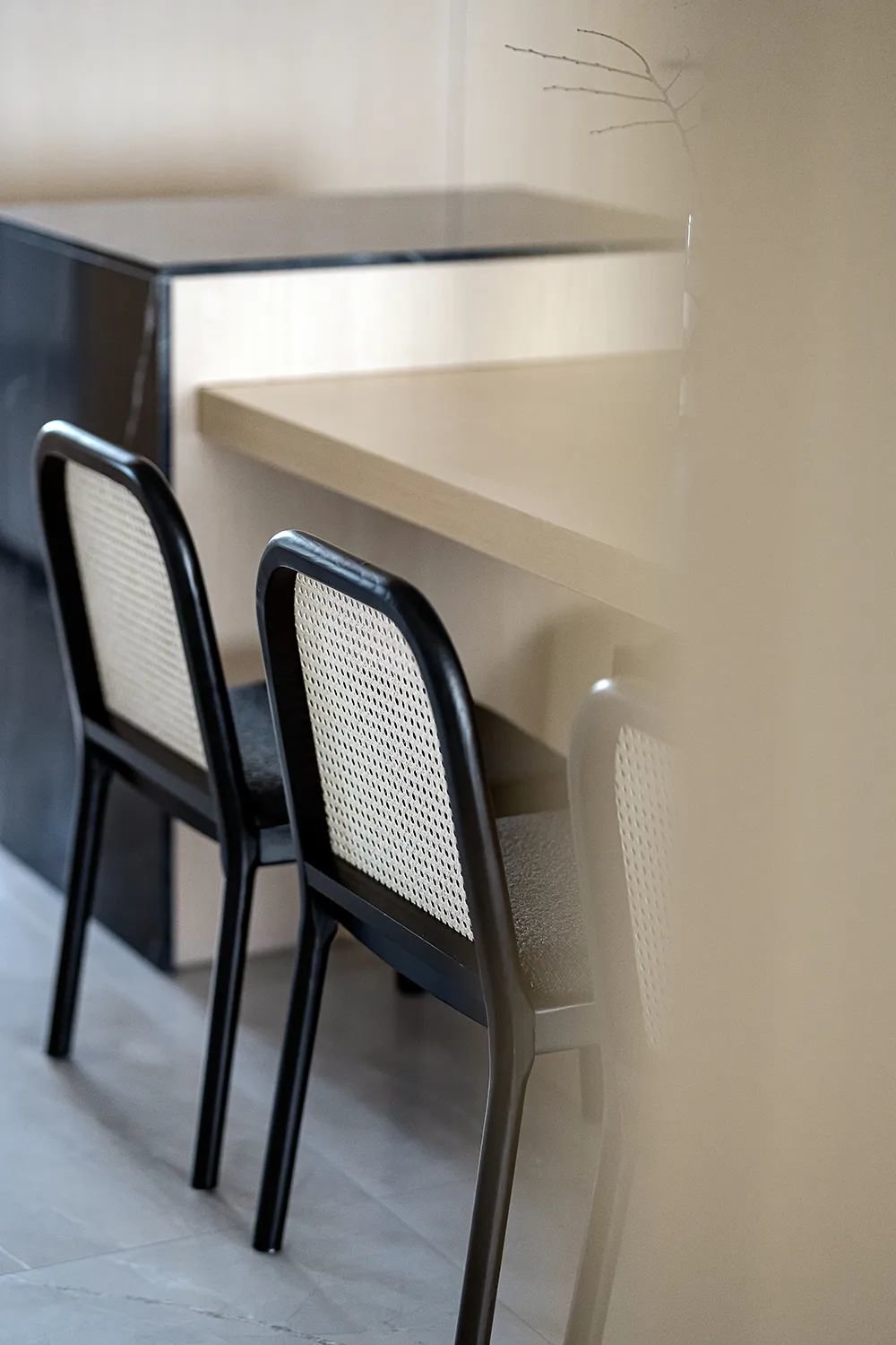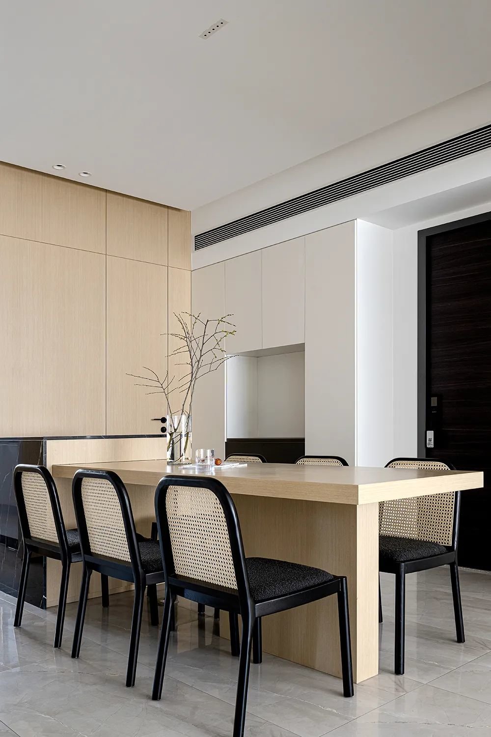 ▲餐厅采用的是岛台+餐桌的形式,黑金属框架的椅子搭配浅木色的餐桌,时尚又个性。