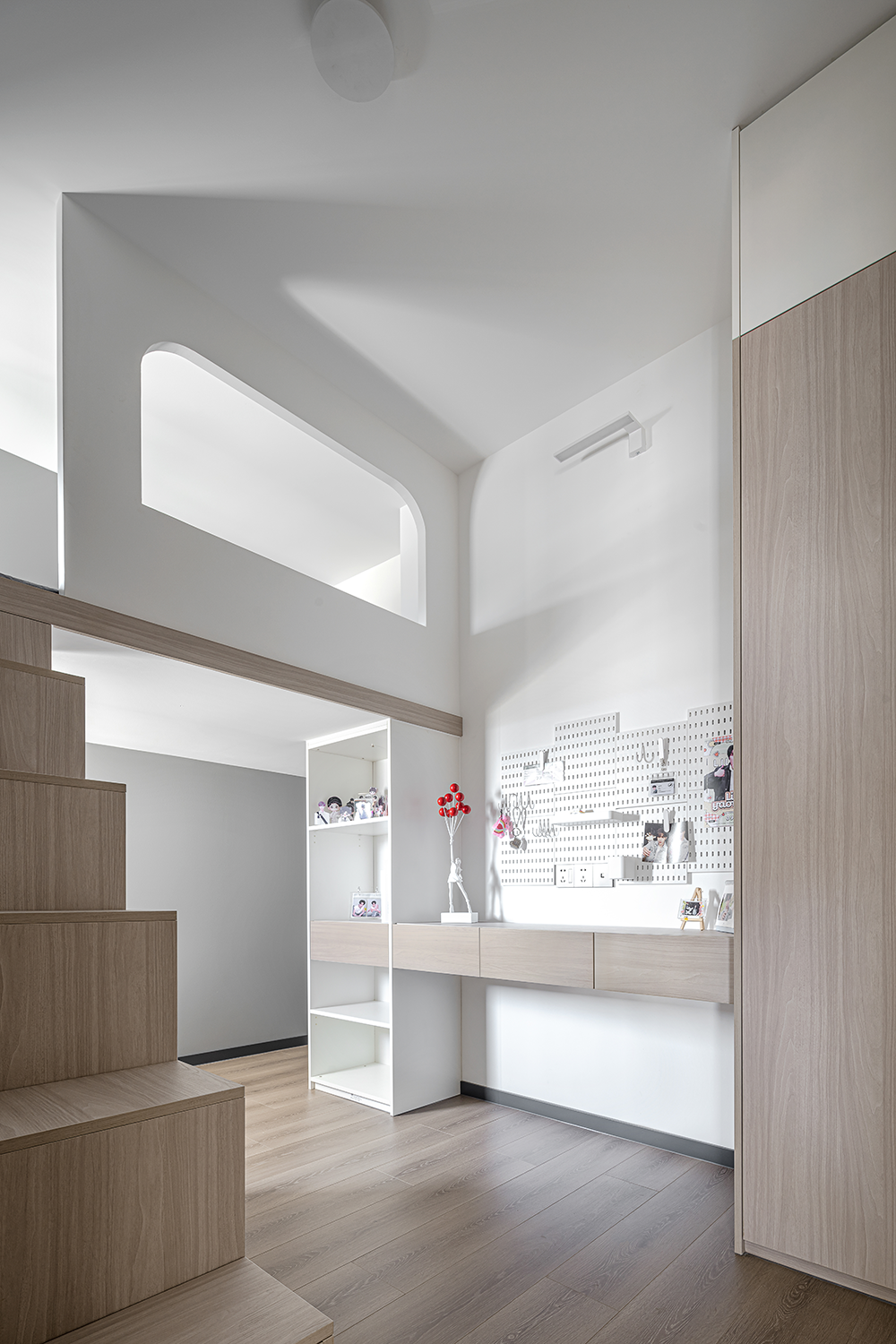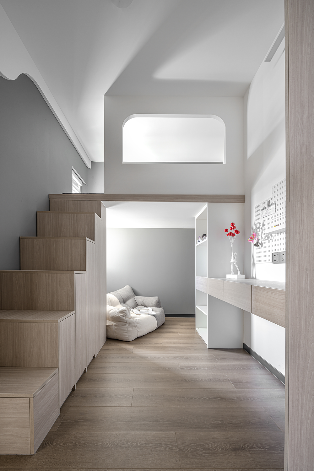 ▲次卧设计师花了一些小心思,把床做成树屋的形式,下面则打造成是主人的私密小空间,放上休息沙发之后,就这么安静地躺在沙发上看书、追剧等实现多种乐趣。