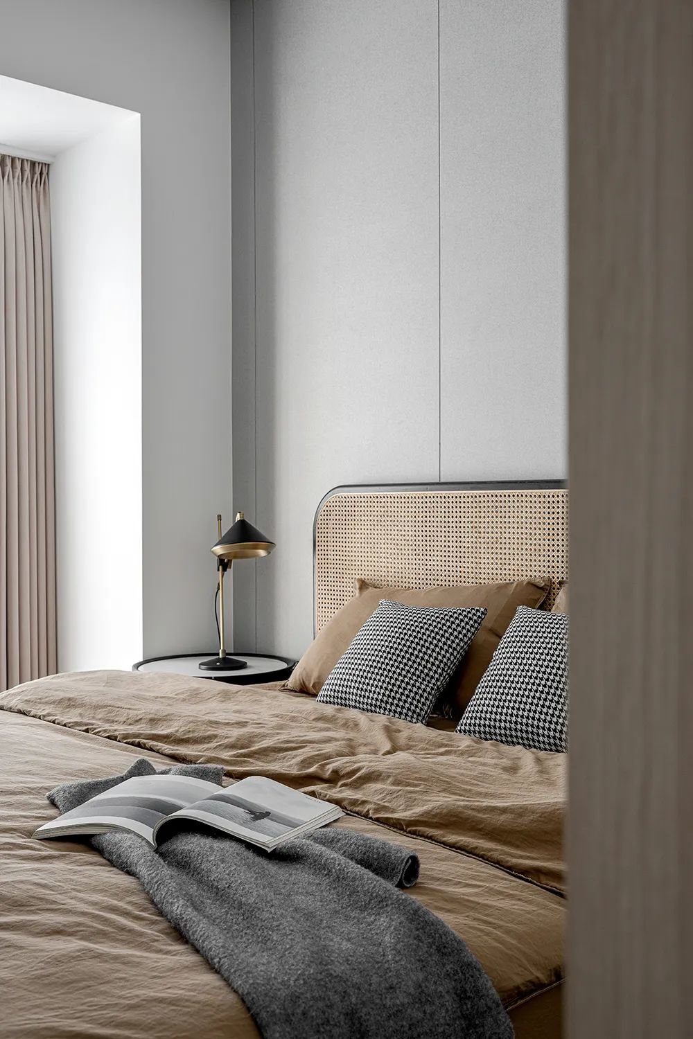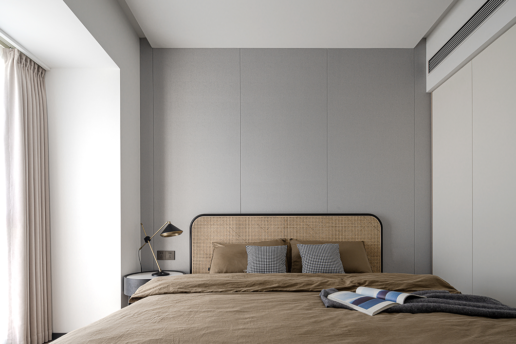 ▲主卧的格调倒是与客厅的一致,床头背景墙采用灰色的护墙板,高级大气。