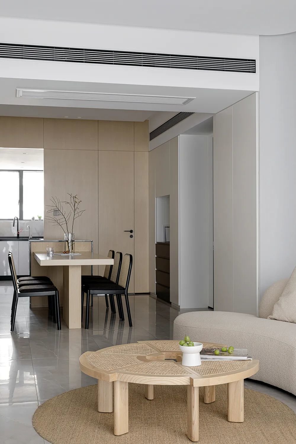▲由客厅看向餐厅的角度,整体格调一致,中间过道藏空调内机,沙发边上的钓鱼灯,造型独特个性,似乎代表着主人的性格。