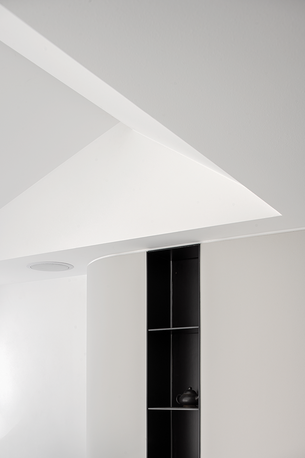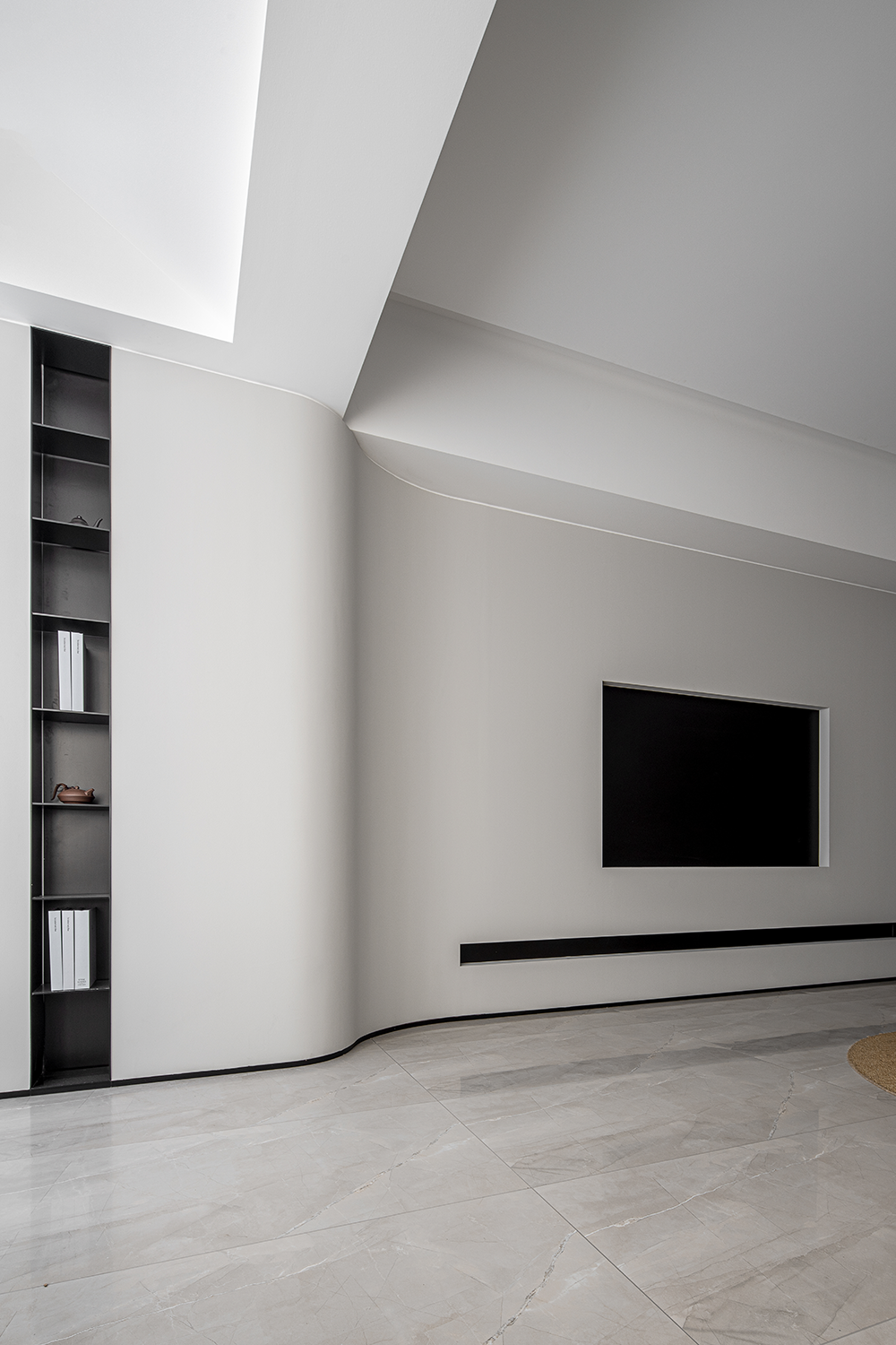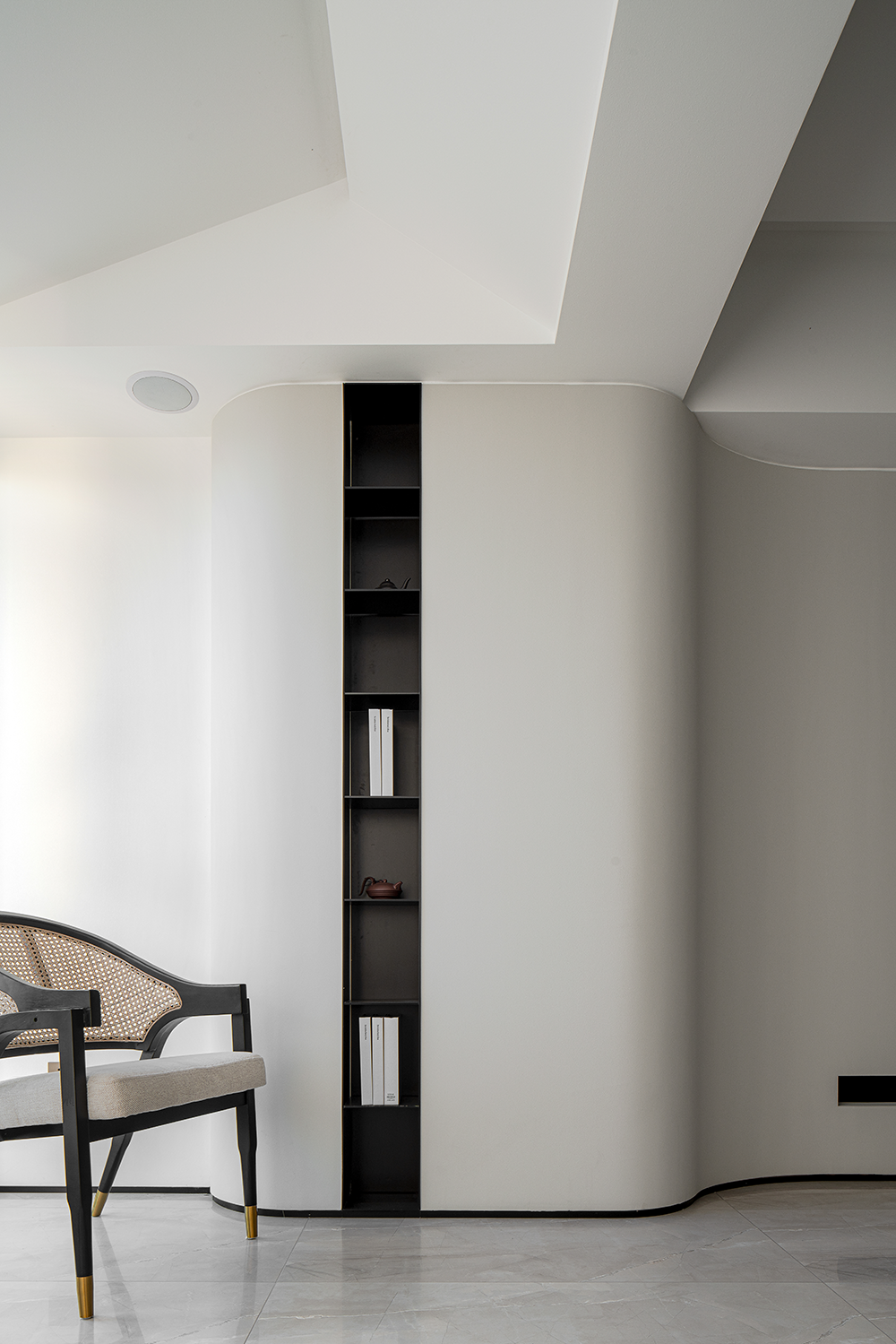 ▲弧形的电视墙,一直延伸到阳台,其实里面包着的是两根下水管道,为了让这个圆弧造型更柔和,设计师加大尺寸,还做了一个壁柜,黑色的格子与黑色的不锈钢相呼应。