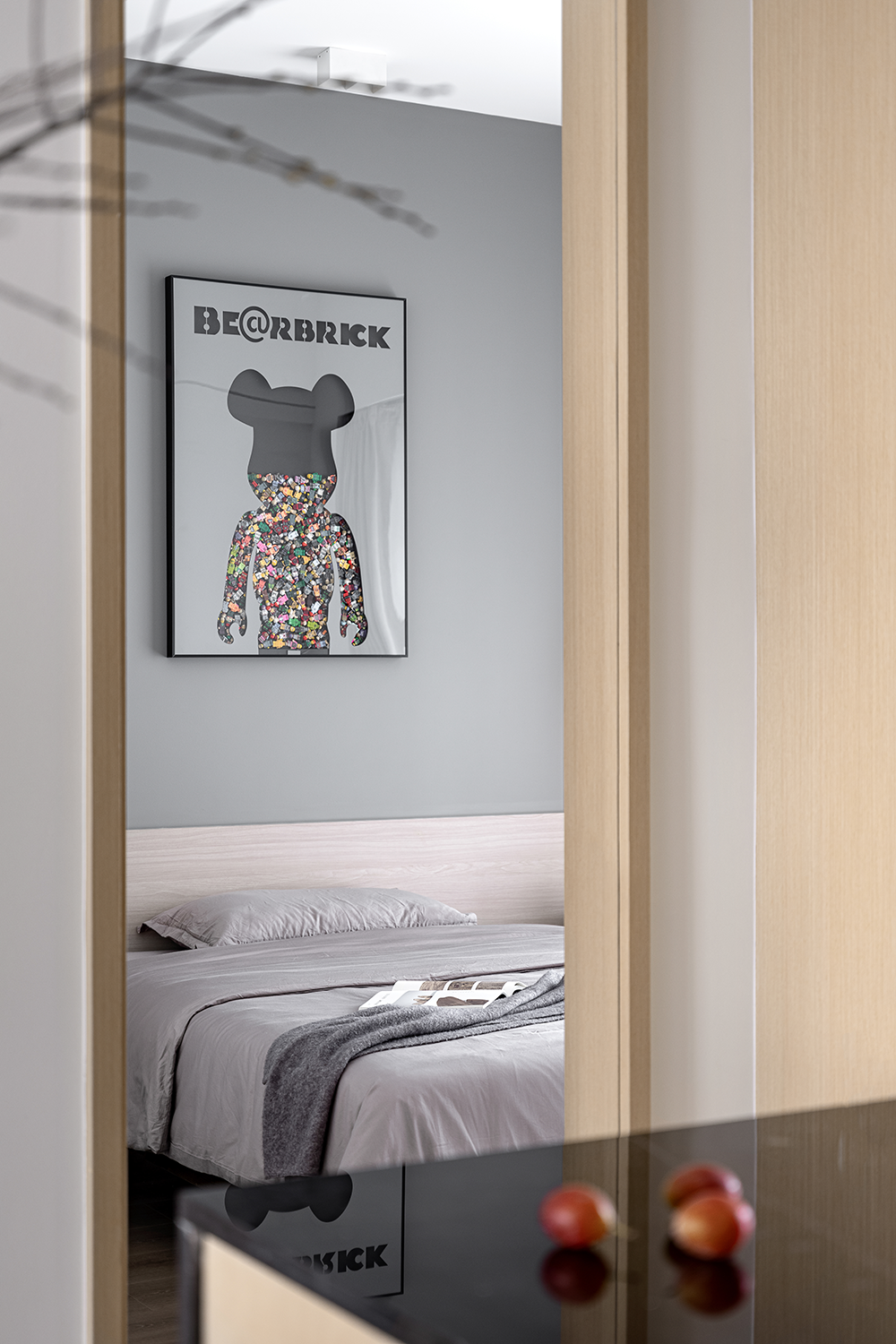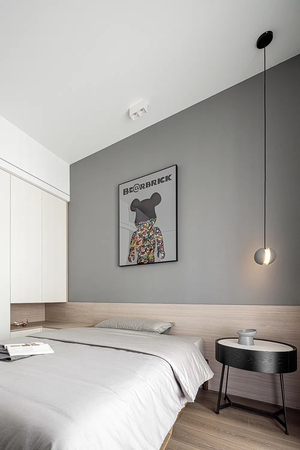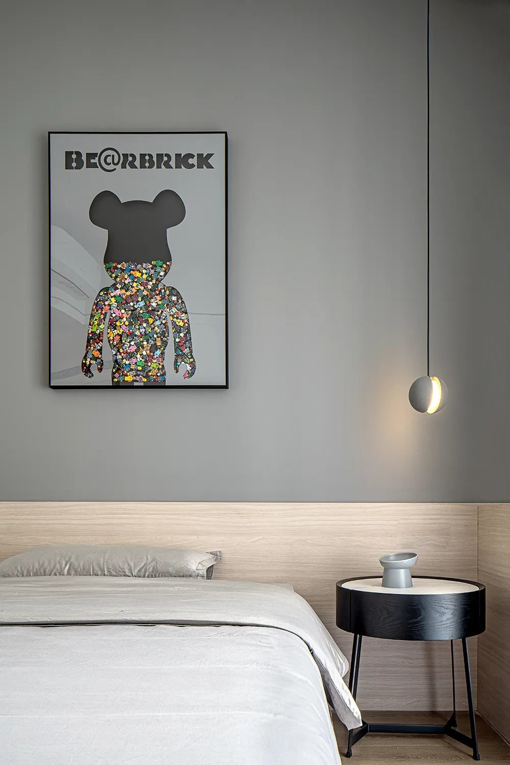 ▲背景墙刷成浅灰色,然后再挂上一幅潮玩积木挂画来装饰,打造出一个个性独特的空间。