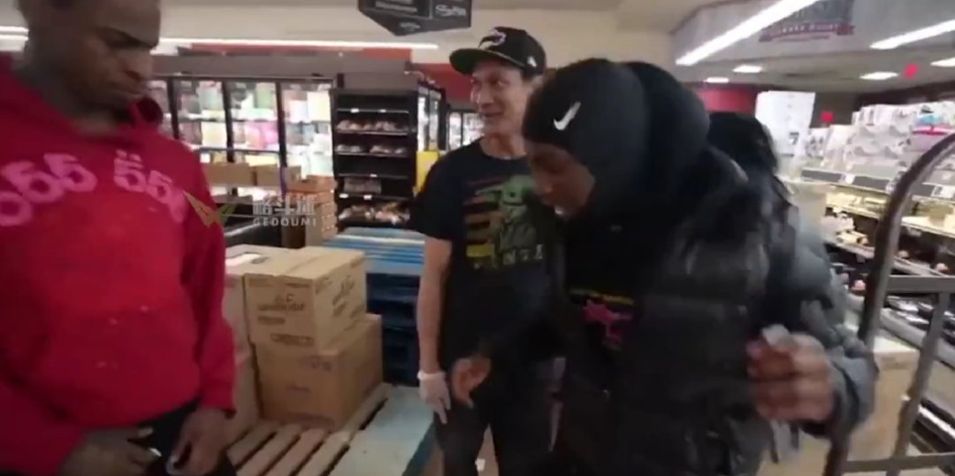 在这段视频中,两个黑人试图抢夺亚裔超市员工的帽子,被亚裔发现后,谎称“自己的手不受控制”。