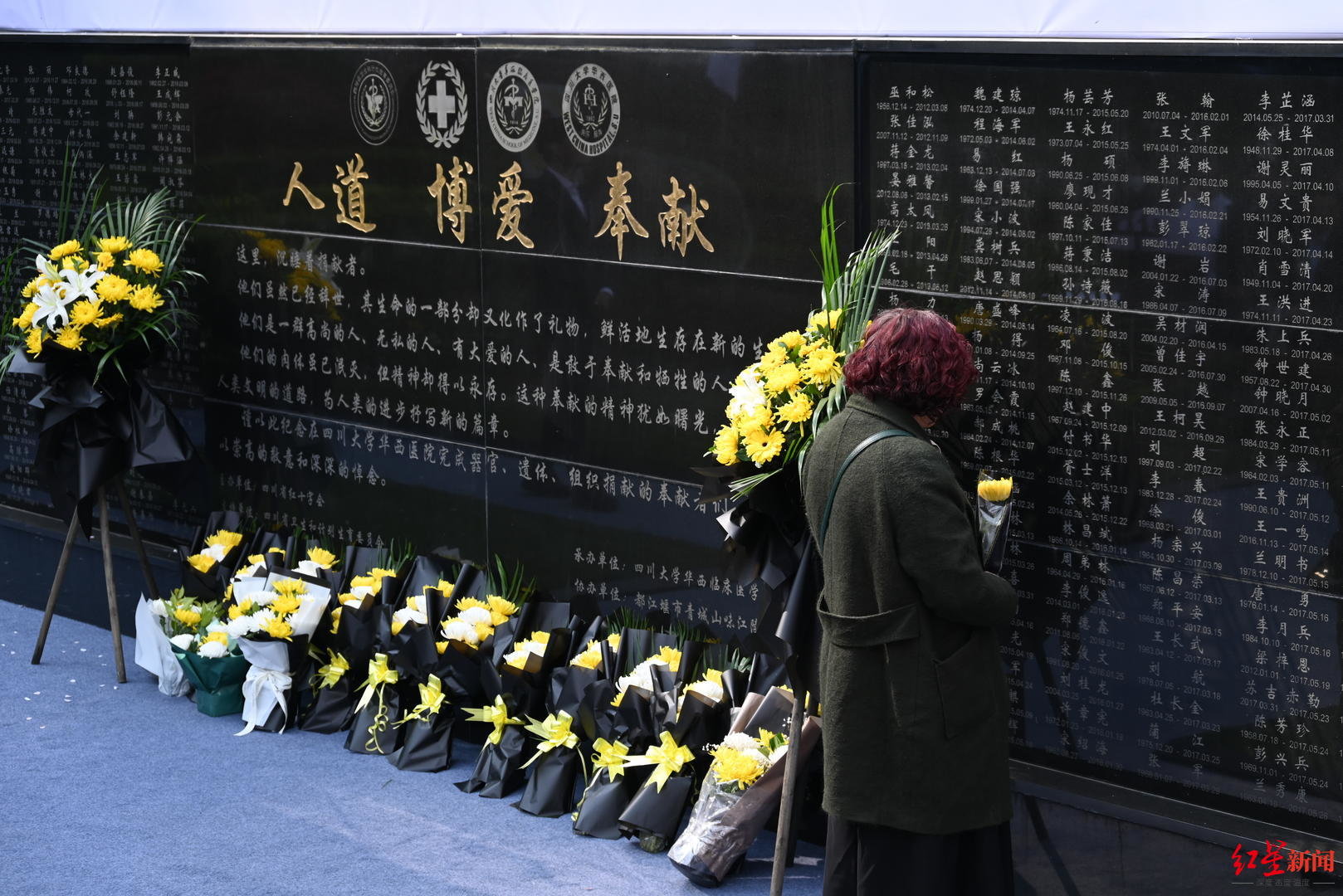 活动现场,捐献者家属、受捐者、四川大学师生及四川大学华西医院医护人员一起,向人体器官和遗体捐献者默哀并敬献花束及礼物表达敬意。