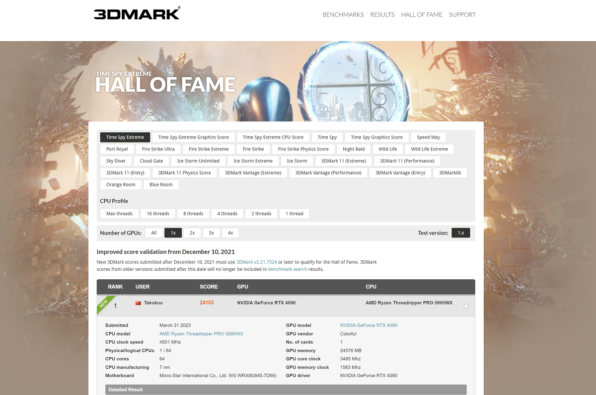 目前七彩虹iGame GeForce RTX 4090 Vulcan LAB单卡在3DMark的Time Spy Extreme测试项目中以24103的分取得世界第一的排名。从截图中可以看出,测试时显卡核心频率为3495MHz,显存频率为1563MHz,超频幅度非常明显。