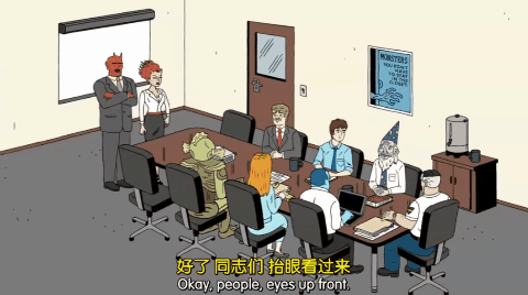 “开会了,同志们都抬眼看过来!(Okay,people,eyes up front!)”