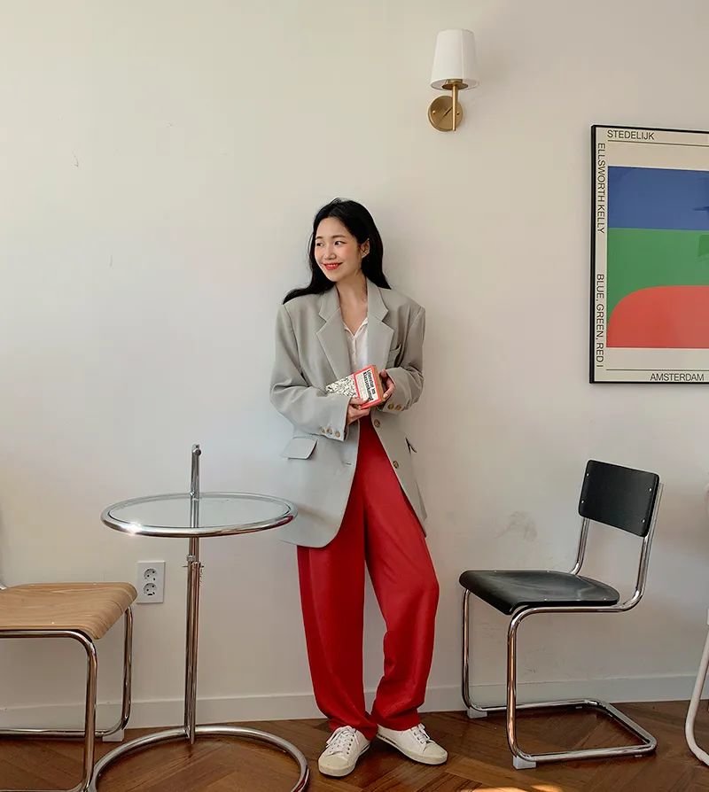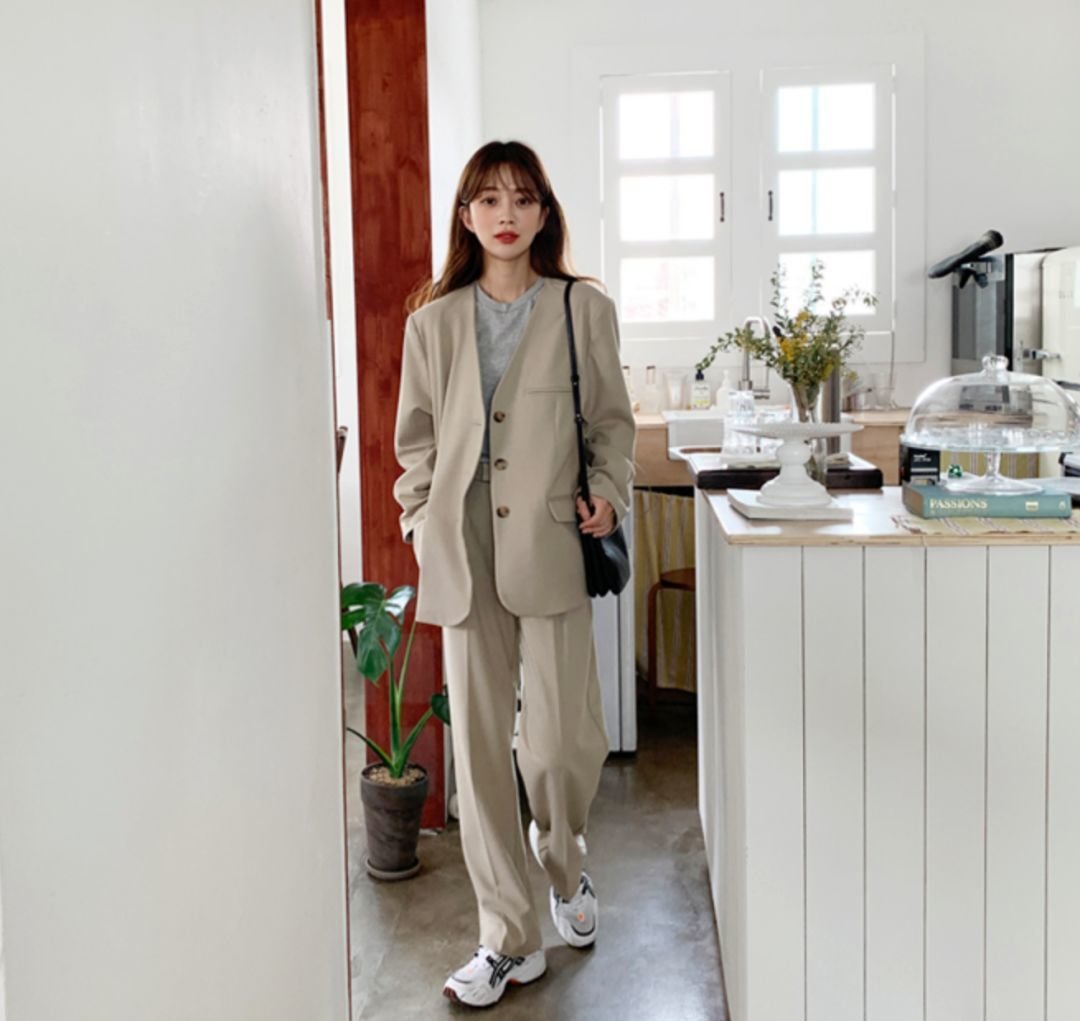 由于搭配的西服大多以浅色为主,所以她们也会选择一些浅色的裤子来搭配CP,视觉上会更加清新和谐。