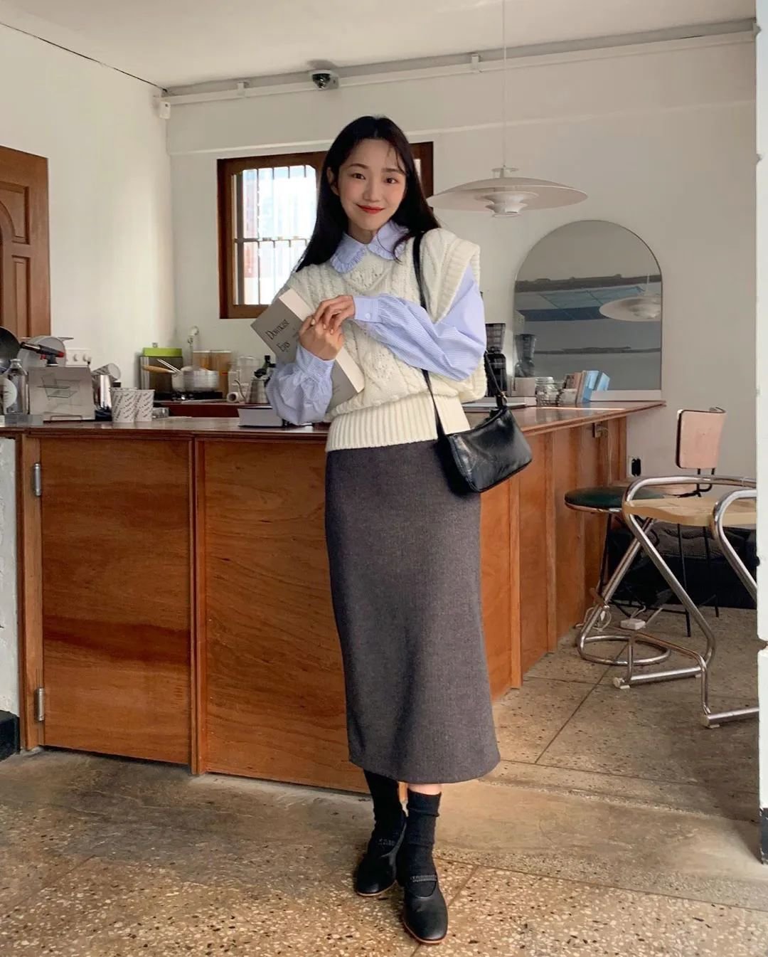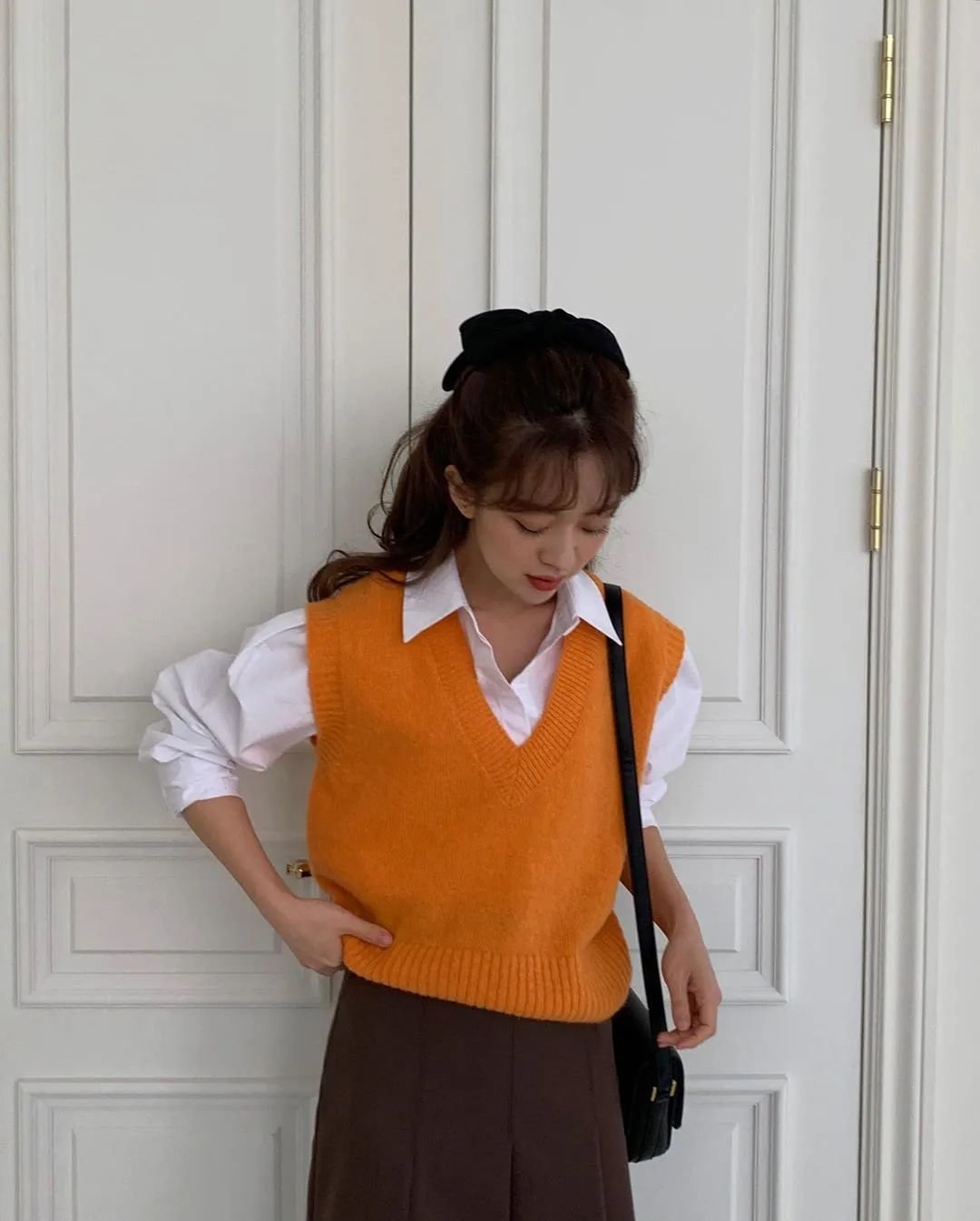 用衬衣来玩叠穿也是韩国女孩的心头好,和针织衫背心组CP,最能打造出文艺复古的学院style。