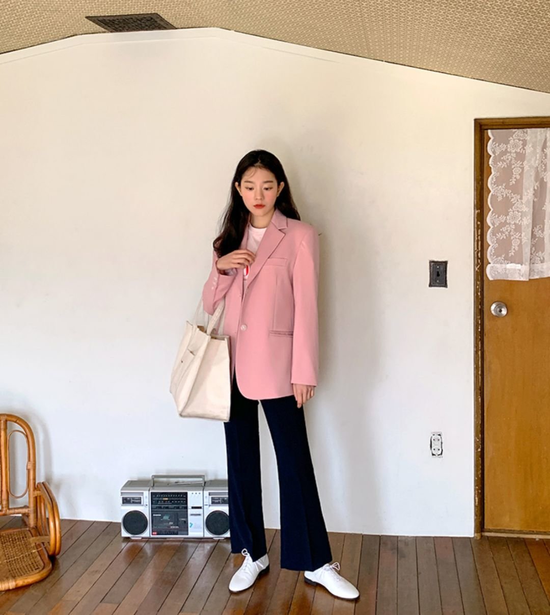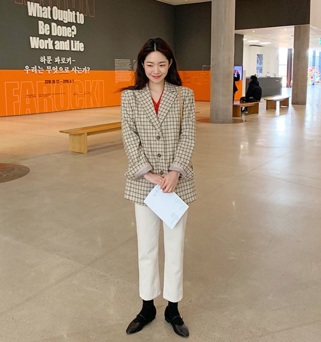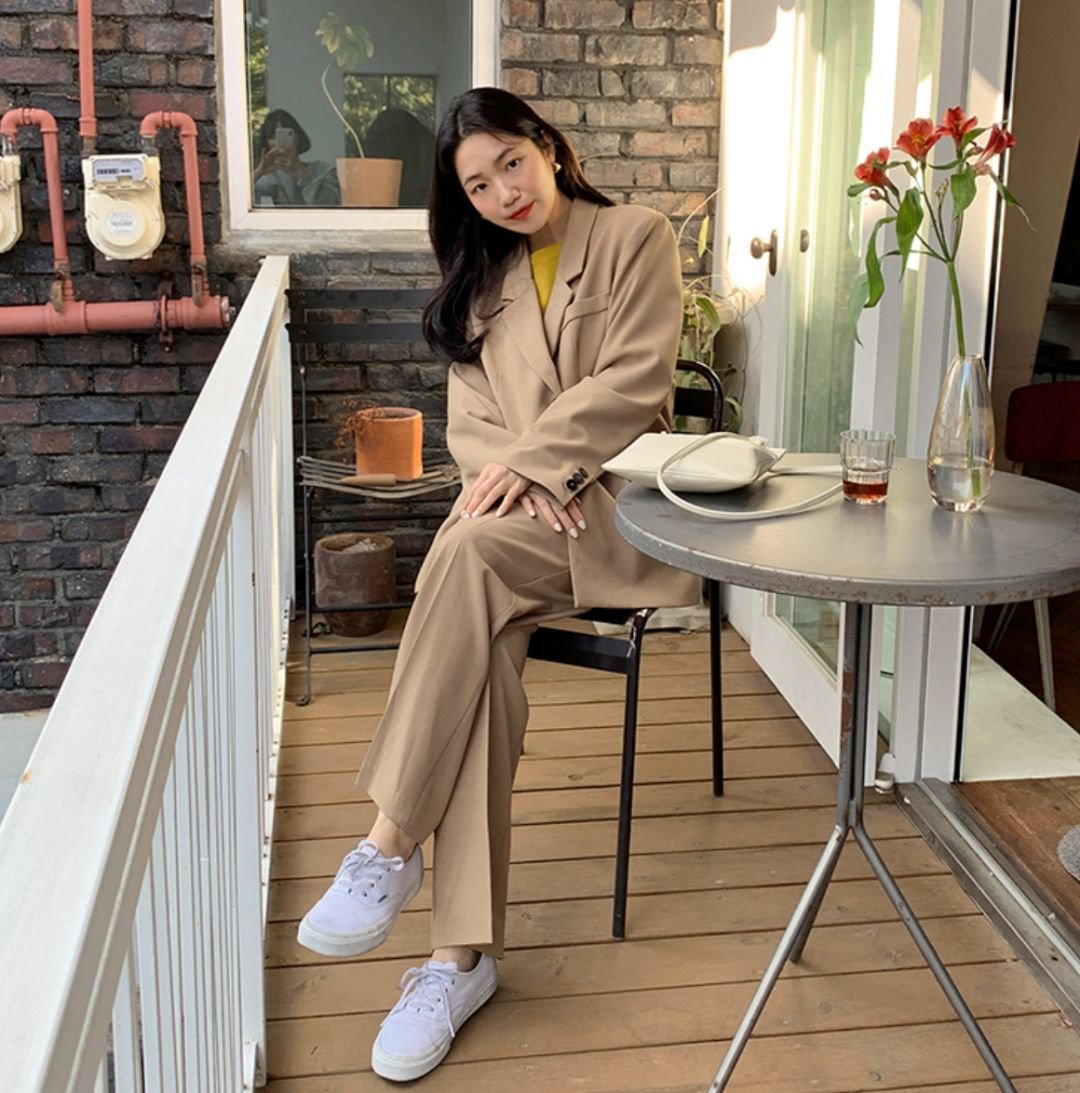 与深色西服相比,韩国女孩更喜欢用浅色西服来营造春天的气息,清新淡雅。