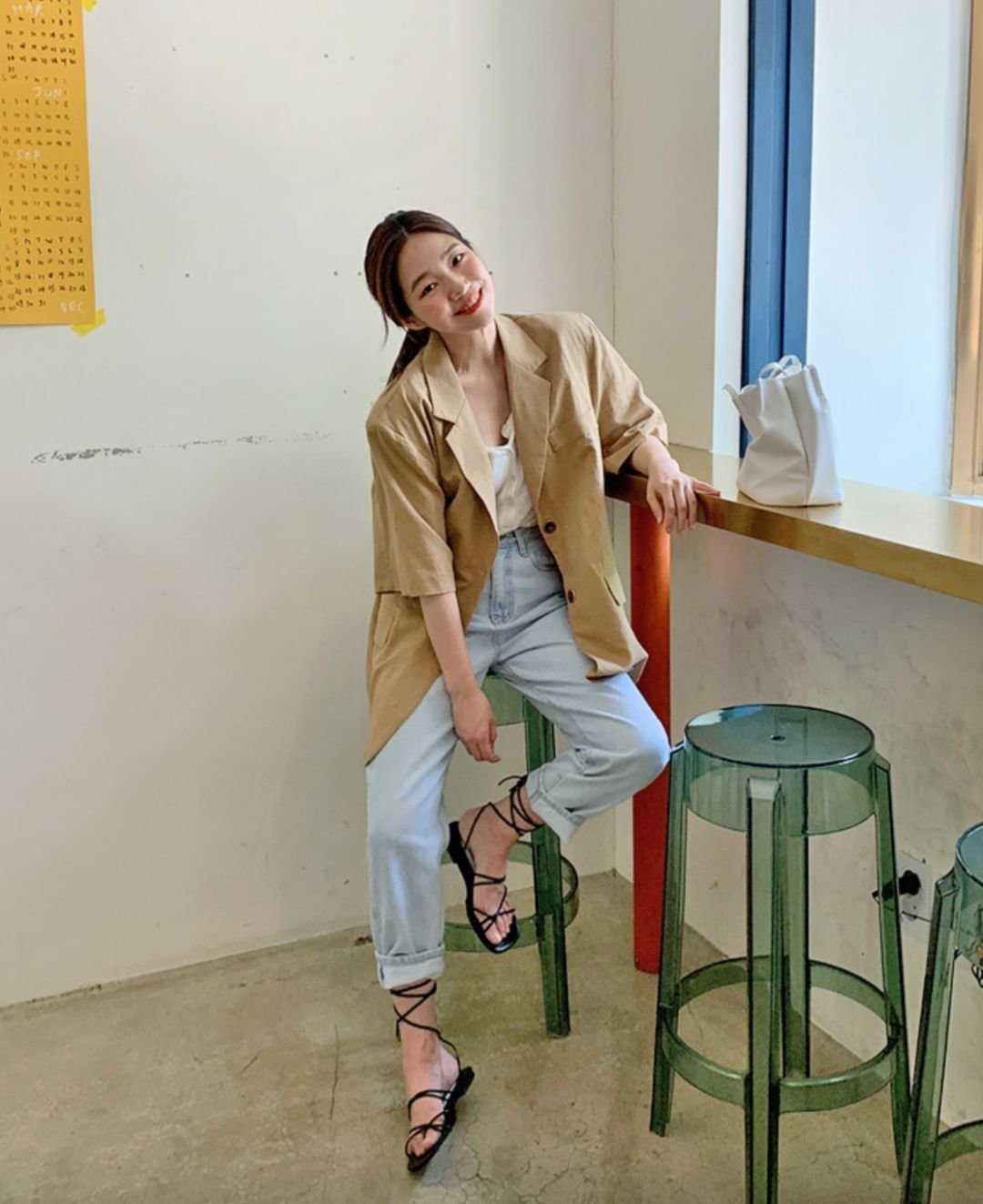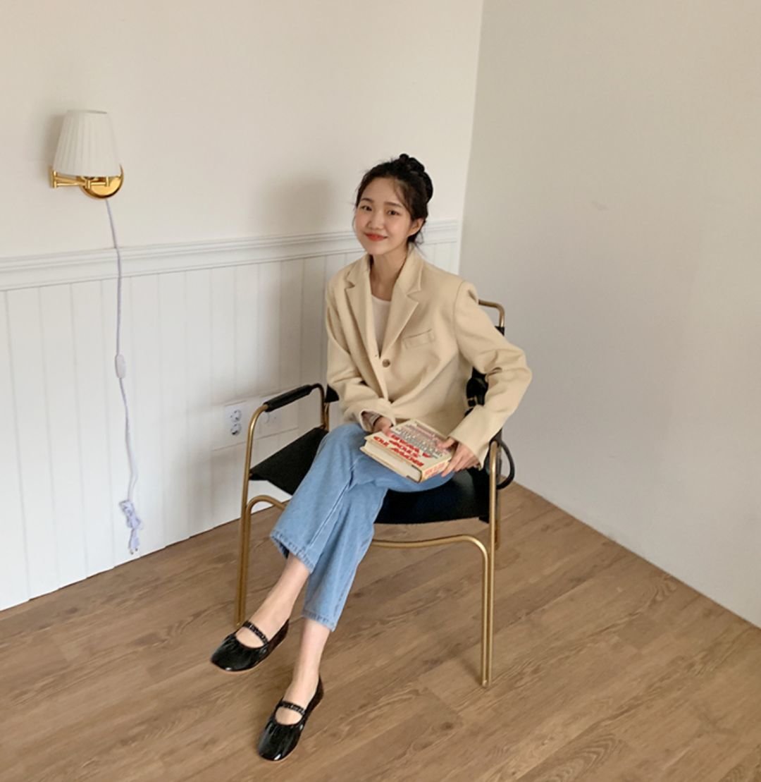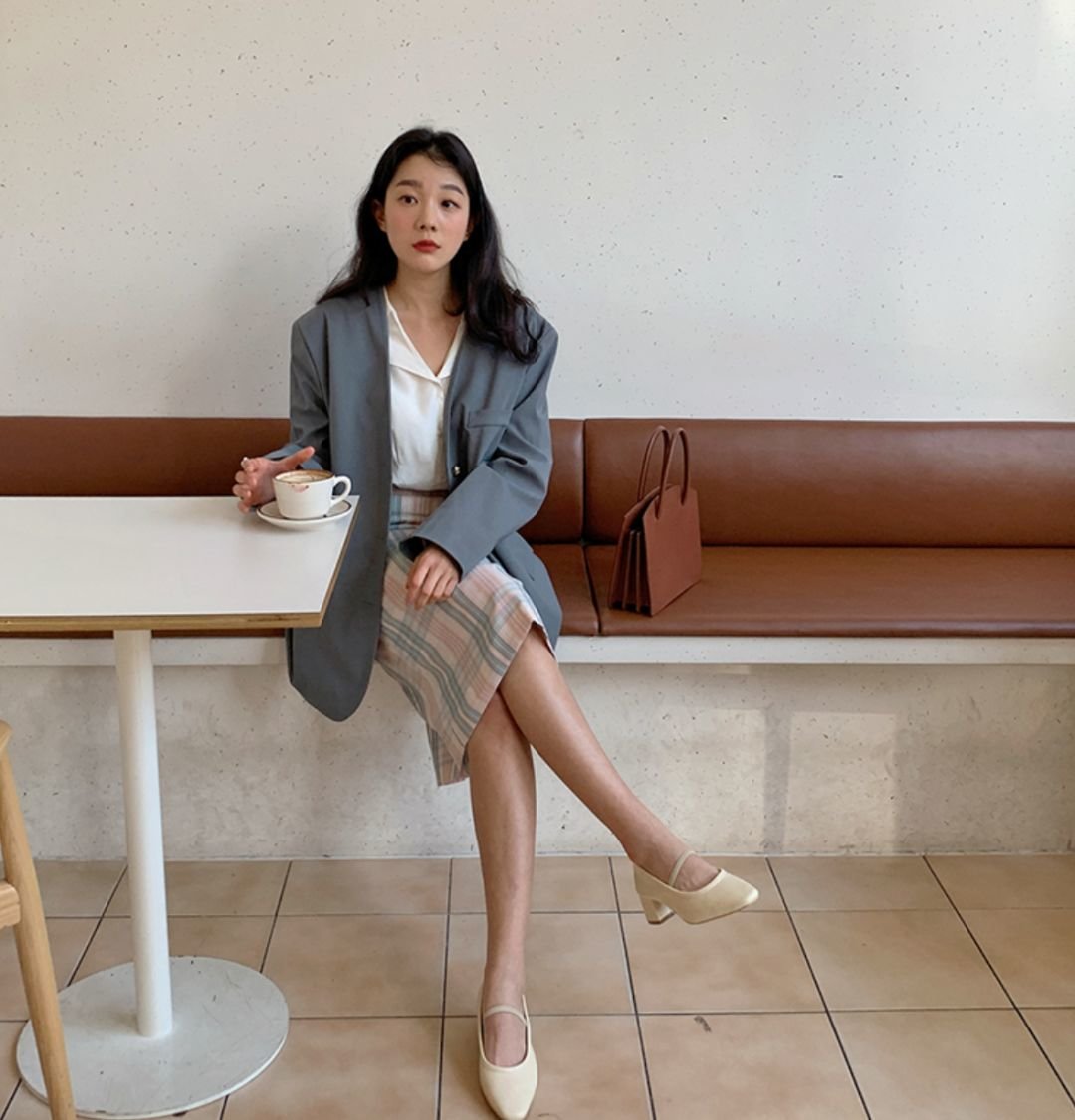 与深色西服相比,韩国女孩更喜欢用浅色西服来营造春天的气息,清新淡雅。