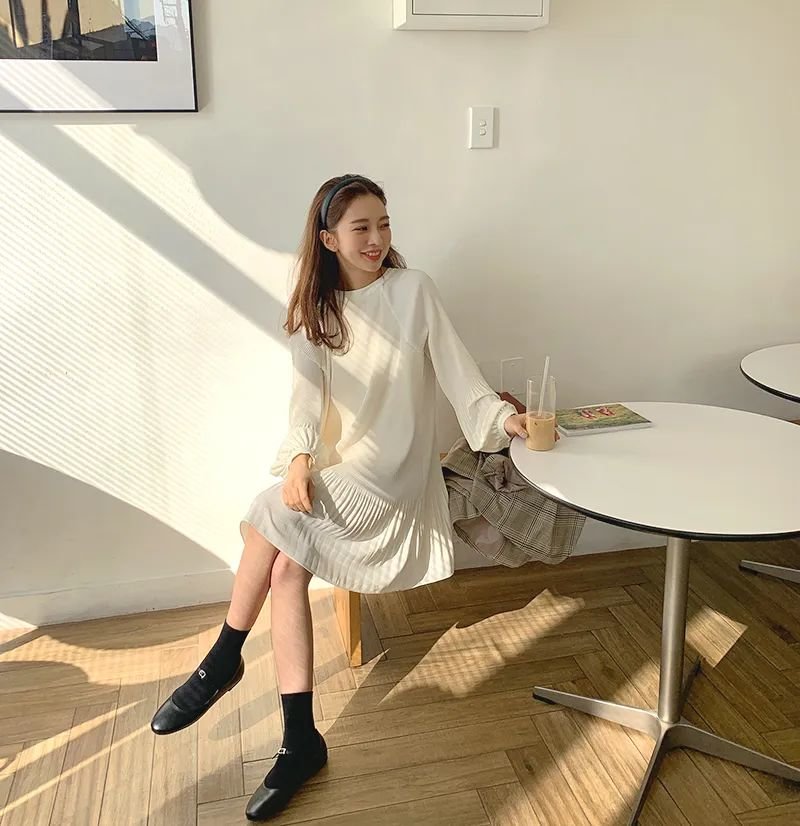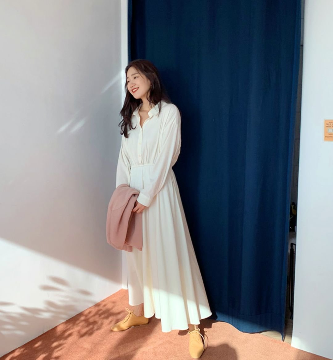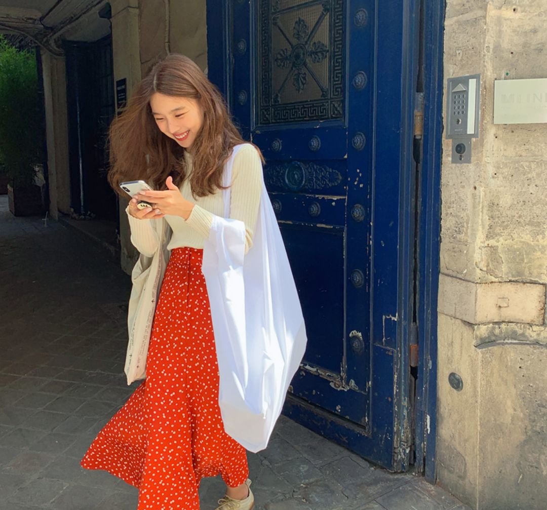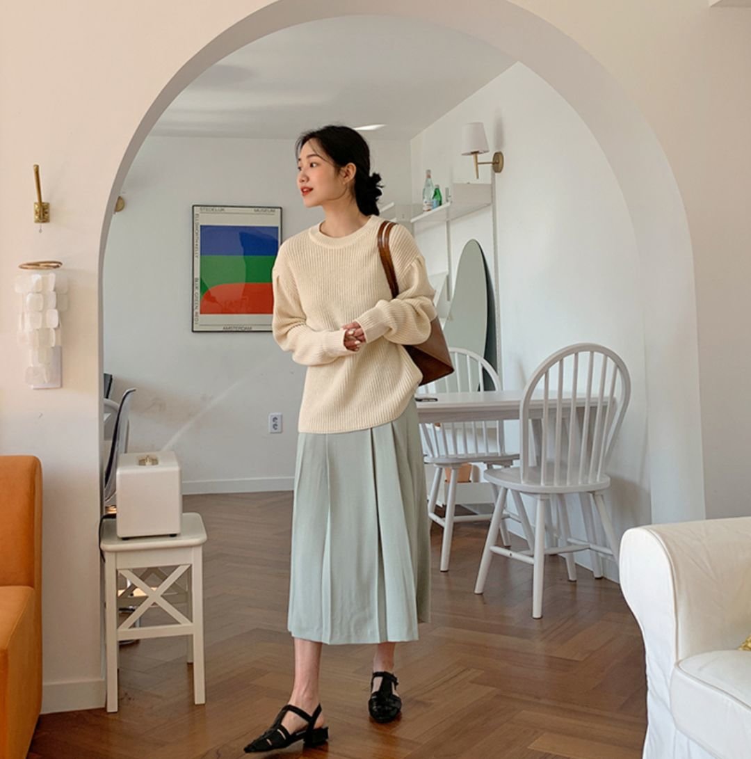 而且使用这款midi裙和针织衫组CP,更能将韩式风格的温柔韵味诠释得淋漓尽致,美得恰到好处。