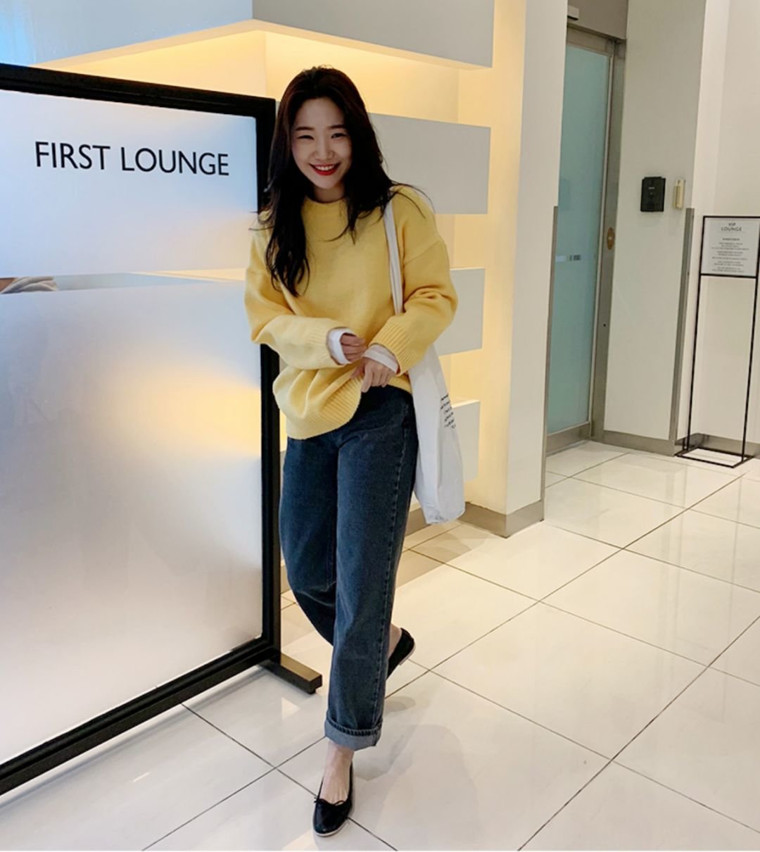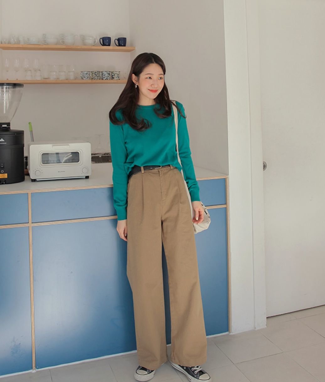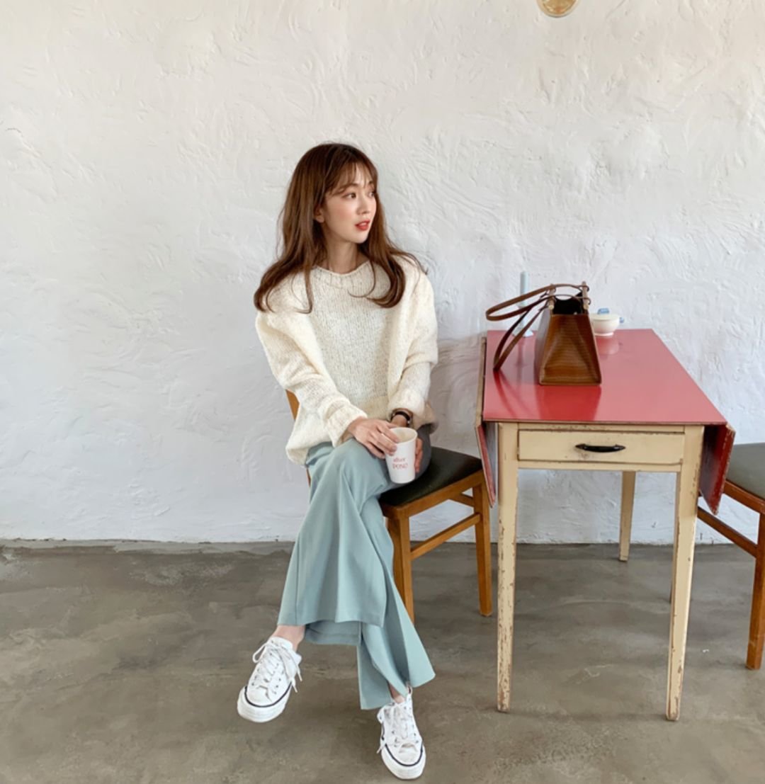 日常出门用毛衣搭配裤子很好看。欧尼一般都是搭配这种宽松的直筒裤,既能修饰腿型,又能营造出休闲自然的风格。
