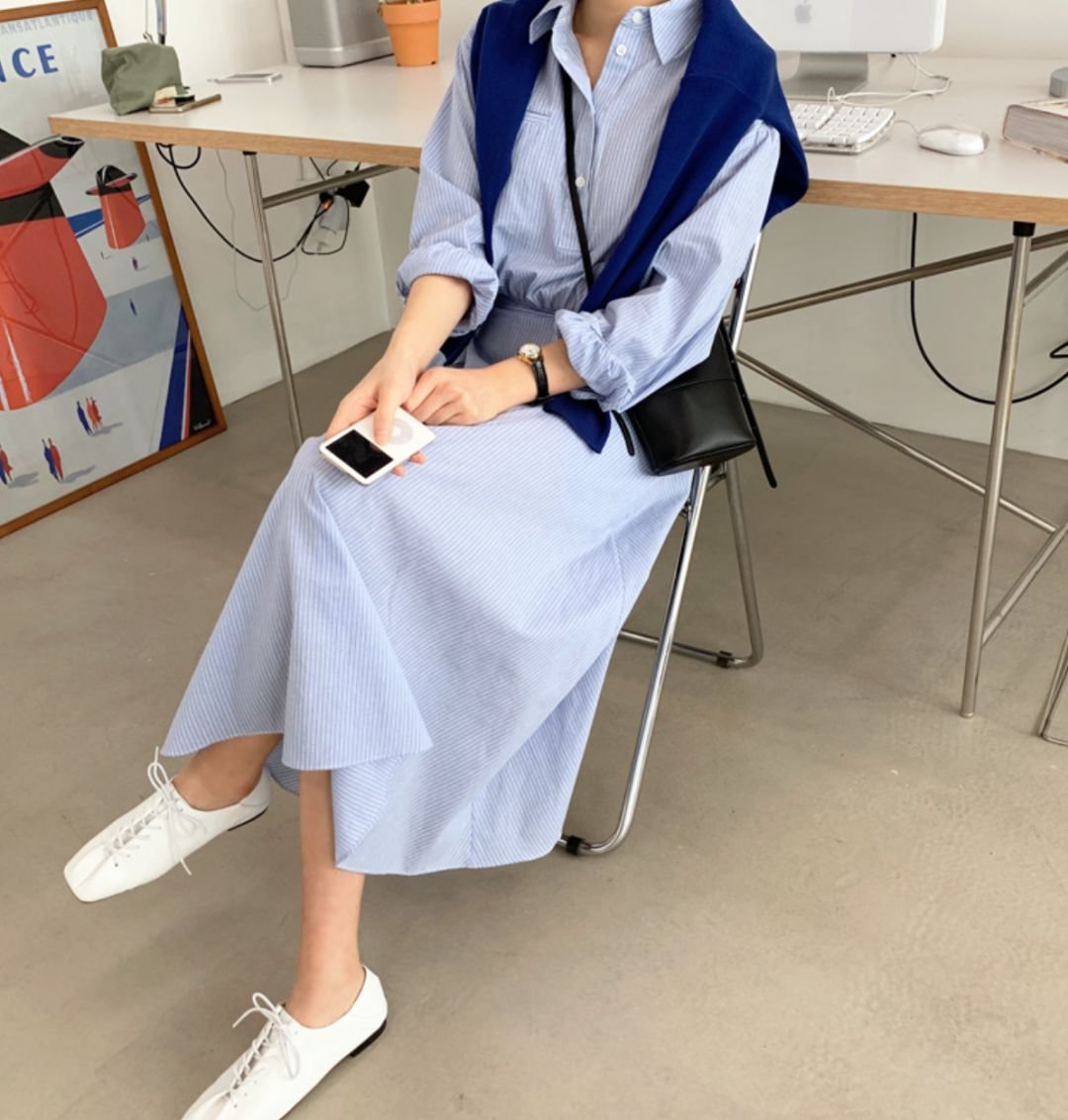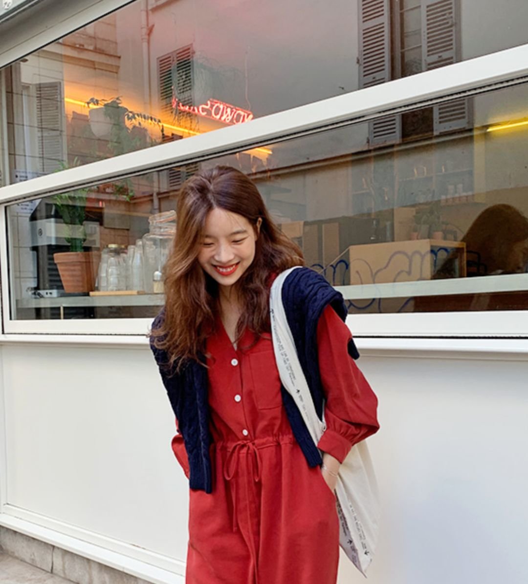 韩国女孩穿连衣裙时,非常喜欢在肩膀上穿毛衣。这种搭配不仅可以丰富造型层次,还可以平衡连衣裙容易滋生的甜腻感,增添一点随意洒脱的感觉。