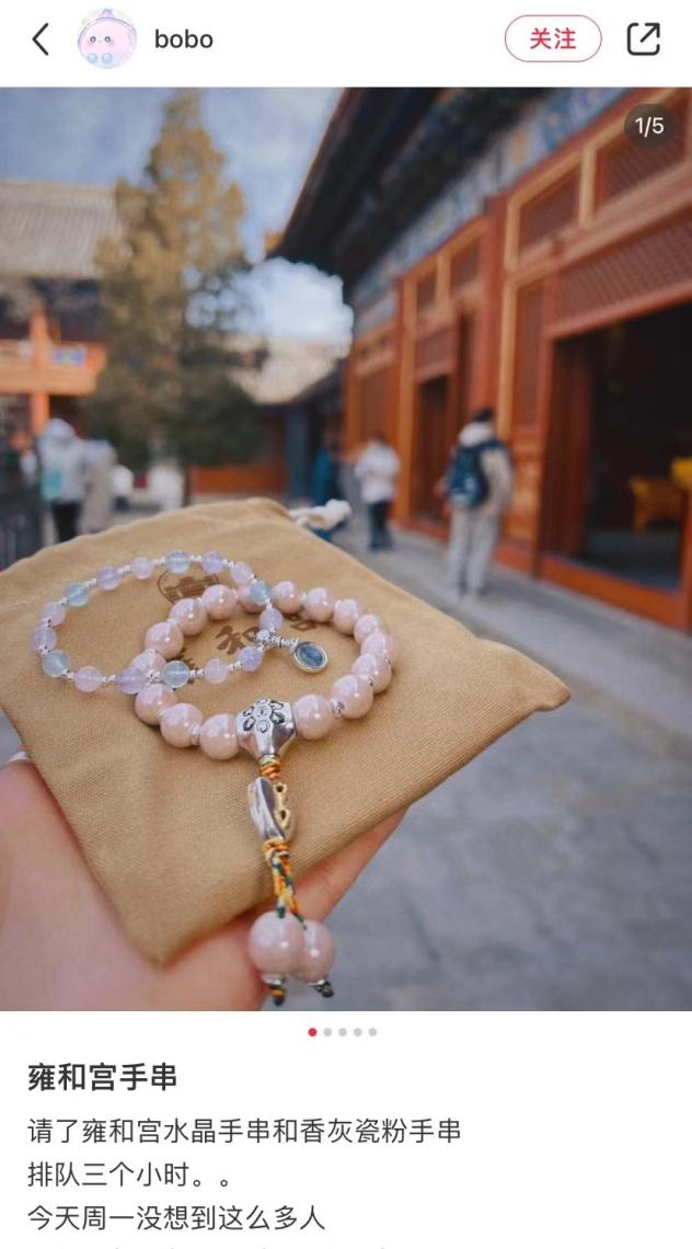 从传播路径来看,雍和宫手串的热度背后自然离不开小红书、抖音等社交媒体的推波助澜。