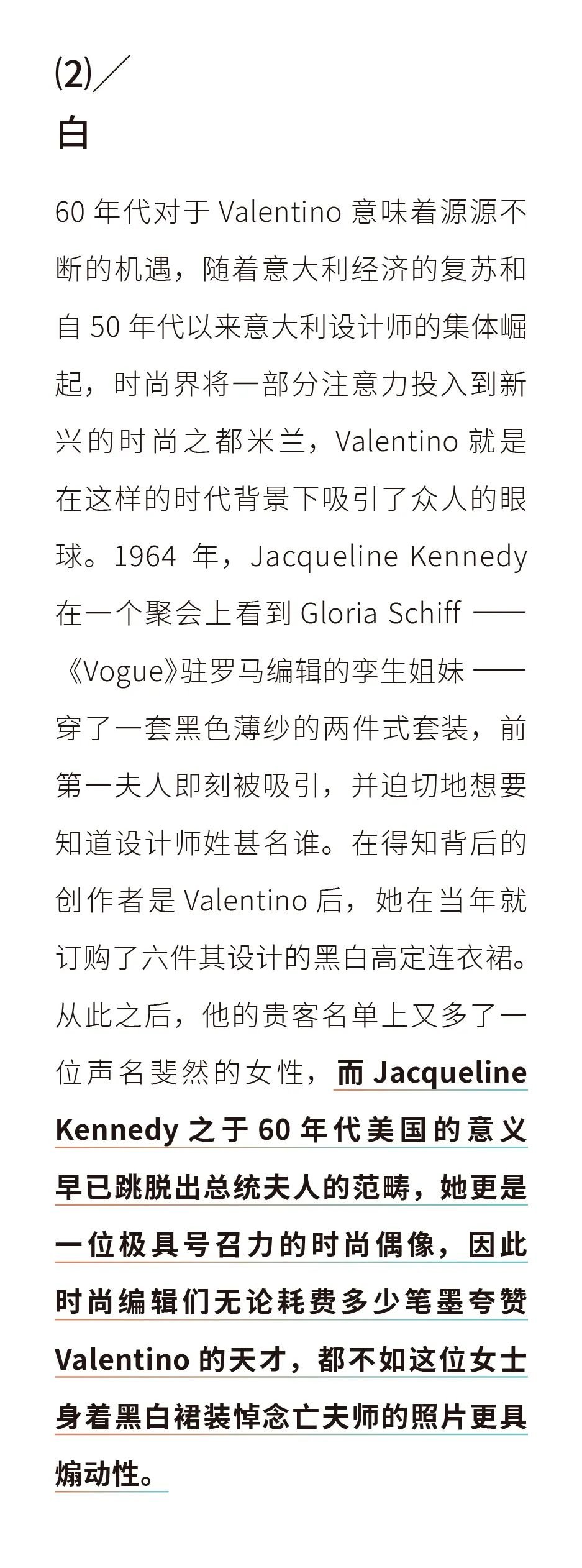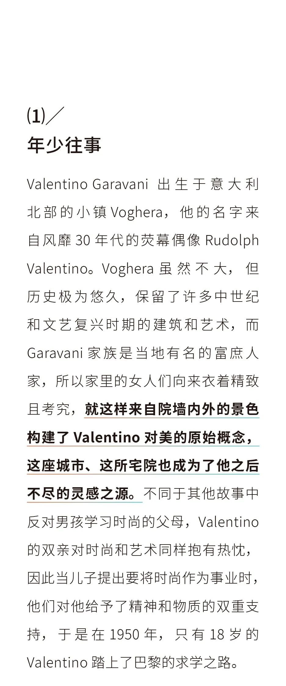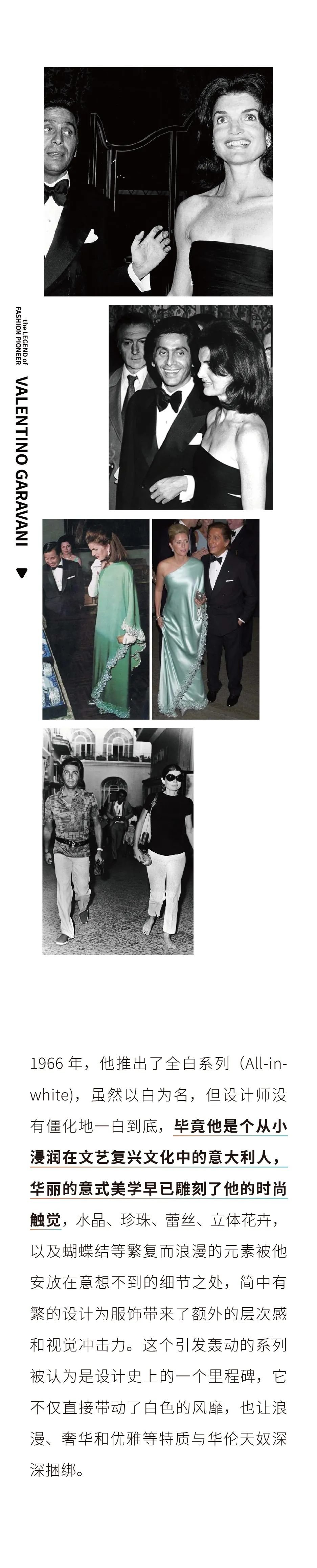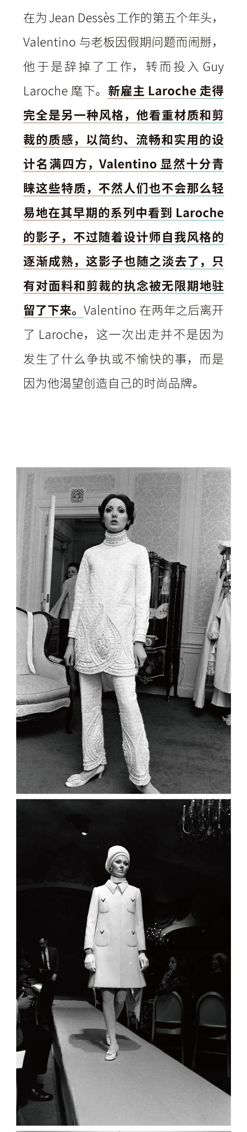 他先后在法国美术学院和巴黎时装工会学习,还在著名时装设计师 Jacques Fath 和 Balenciaga 的工作室中得到了实习机会,几经周转后,年轻人最终在 Jean Dessès 的时装屋落了脚。这段经历举足轻重,Dessès 曾是Balenciaga 的助手,在自立门户以后,他优雅而浪漫的风格吸引了一众地位显赫的客人,因此他的时装屋对于年轻设计师来说不仅仅是个学习怎么做高级时装的地方,也是一扇通往巴黎顶级社交圈的大门。Valentino 就幸运地服务了贵族小姐 Jacqueline de Ribes,他将她言语中抽象的时尚构想带进现实,前者的才华与后者的谦逊促成了一段跨越世纪的友情,在之后逾越 70 载的时间里,她不知穿了多少件由他设计的礼服出入名利场。