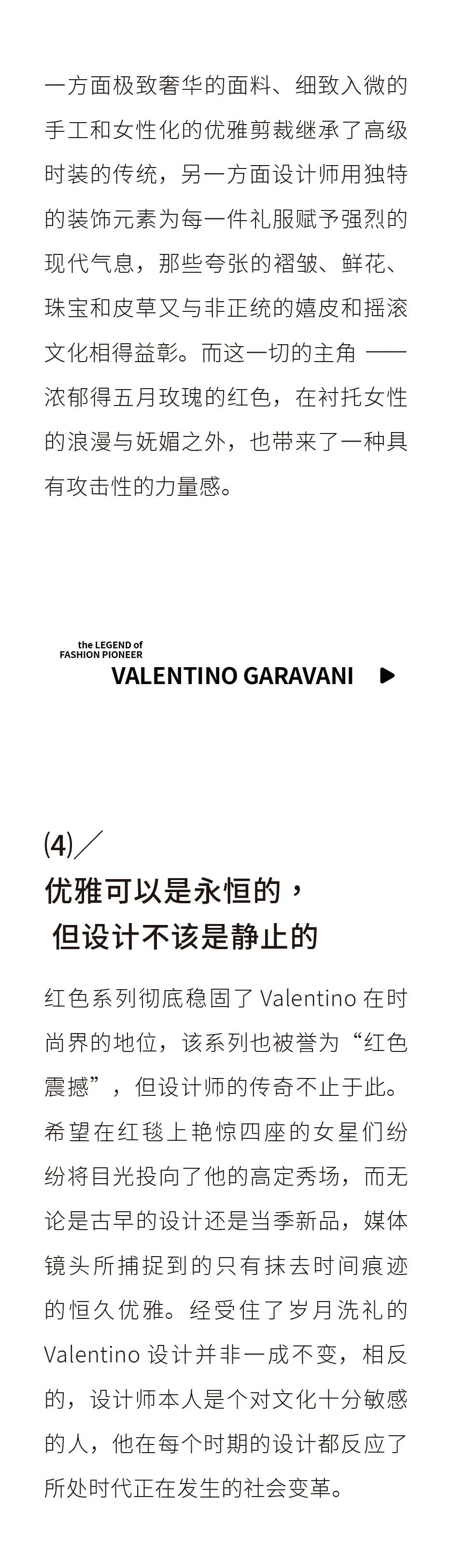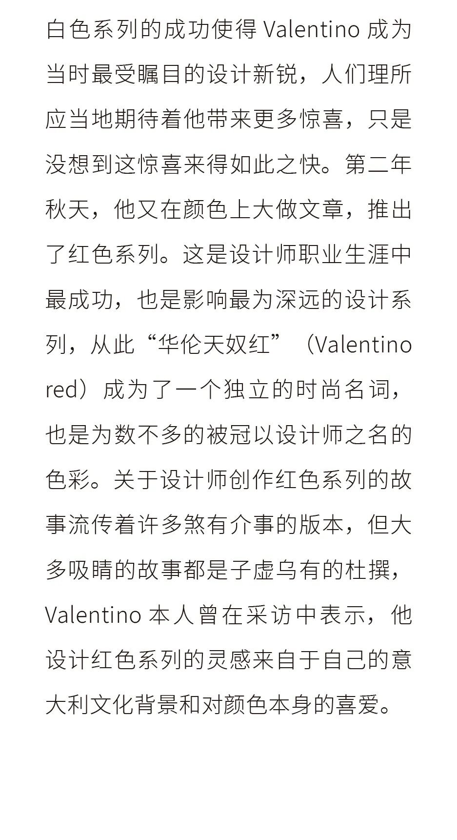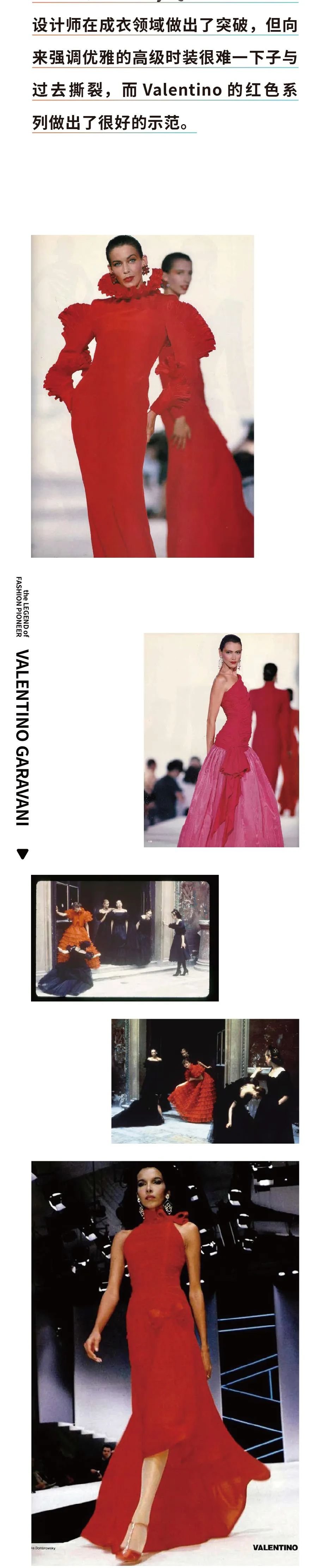 1980 年后期至 1990 年代初期是 Valentino 的转型期,他不仅推出了第 一个男装系列,还在 1991 年推出了女士休闲服饰品牌 Red Valentinoo 这一时期,他从之前一直追求的奢华设计风格,开始朝着更加简约的方向发展,将华丽而繁复的细节和装饰减少到最小,从而使时装的轮廓和线条更加利落,以回应更加生活化的 90 年代时尚。