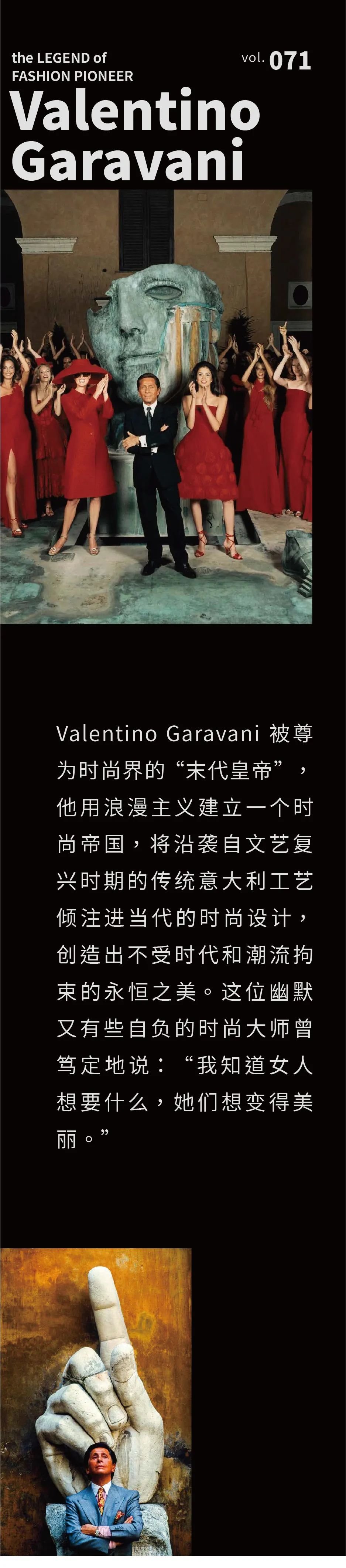 他没有回到自己的小镇,而是在罗马开启时装事业。起初,他只负担得起一间小得只能容纳两个人的工作室,而为了吸引顾客,他把宠物猫放在窗台,让它担负起揽客的“任务”。这个策略十分成功,客人们开始涌入他的工作室,他逐渐在罗马有了些许名气。1960年,Valentino 的事业和生活都迎来的转折,他在弗洛伦萨的一场时装秀上与 Giancarlo Giammetti 一见如故,尽管对方是一名会计师,但是他们对时尚的见解与他不谋而合,他们很快发展为恋人关系,并作为联合创始人成立品牌华伦天奴。人们相信,来一直站在设计天才背后的 Giammetti 成就了华伦天奴今时今日的地位,当专注于创作的 Valentino 无暇顾及经营的细节时,Giammetti 总会将一切安排妥当,曾担任华伦天奴品牌总裁的 Matteo Marzotto 说:“我不认为没有了 Giancarlo 的 Valentino 还有有现在的成绩,可能连一半,甚至三分之一都不到。”