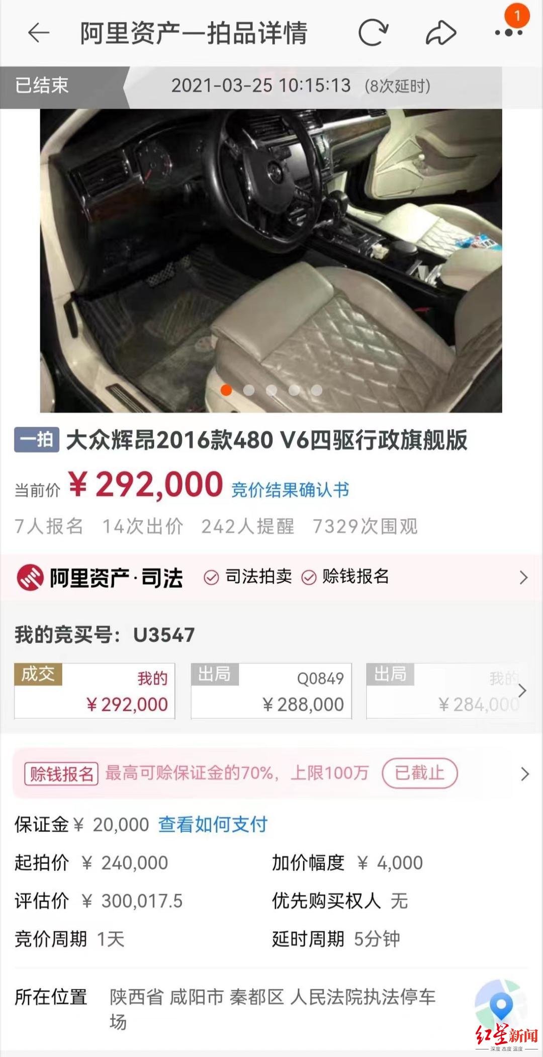 2021年3月,家住新疆塔城的张先生在淘宝网司法拍卖平台看中一款二手大众辉昂轿车,拍卖方为陕西咸阳市秦都区法院。当月24日,经过竞价,张先生以29.2万元的价格在法拍网上拍得了这辆轿车。