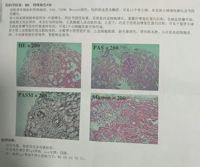 做肾穿刺明确病理,IgA局灶增生型,lee氏分级Ⅲ级,牛津分型M1E0S0T0-C1。