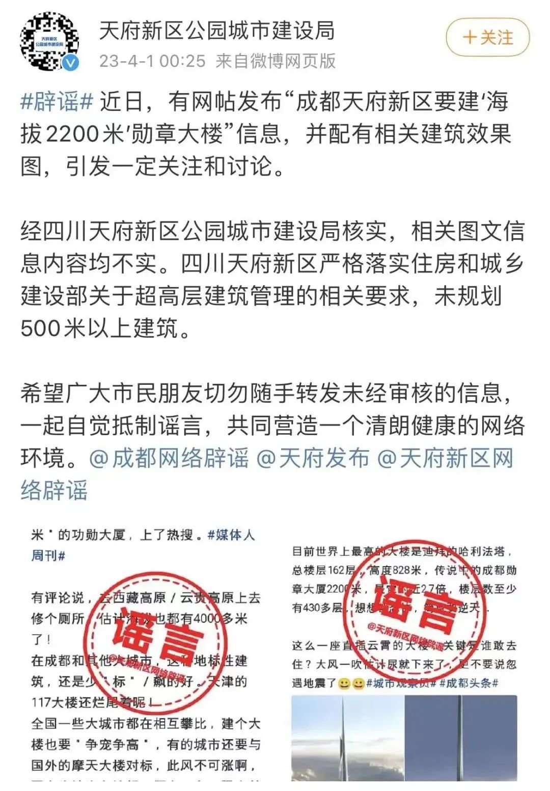 针对网传信息,四川天府新区公园城市建设局通过官方微博发布辟谣称:经核实,相关图文信息内容均不实。四川天府新区严格落实住房和城乡建设部关于超高层建筑管理的相关要求,未规划500米以上建筑。