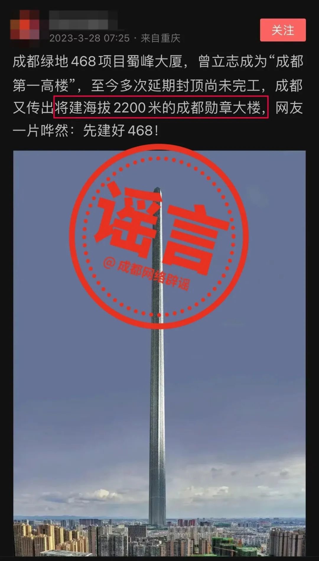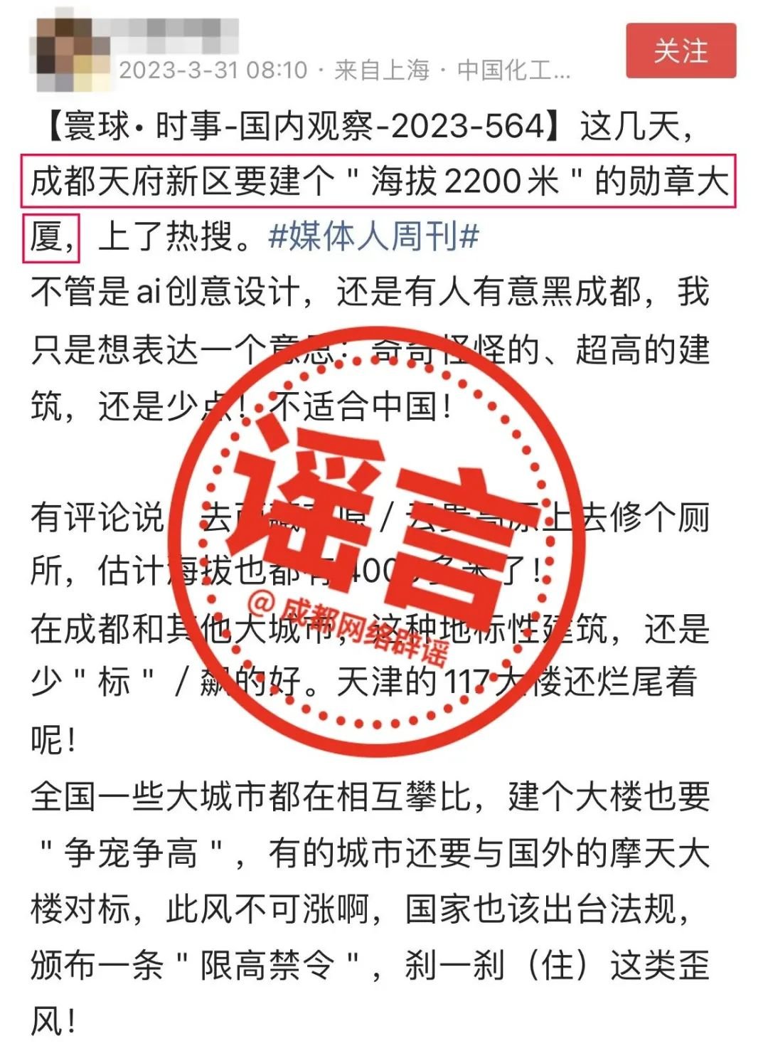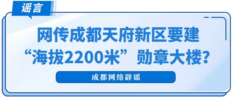 近日,有不少自媒体账号发消息称,“成都天府新区要建海拔2200米勋章大楼”,并配有夸张的视觉效果图片。该消息引发网民关注热议,不少网民对此表示质疑,评论调侃称“这不成了太空电梯?坐个电梯半小时?”“先建好468项目蜀峰大厦”。