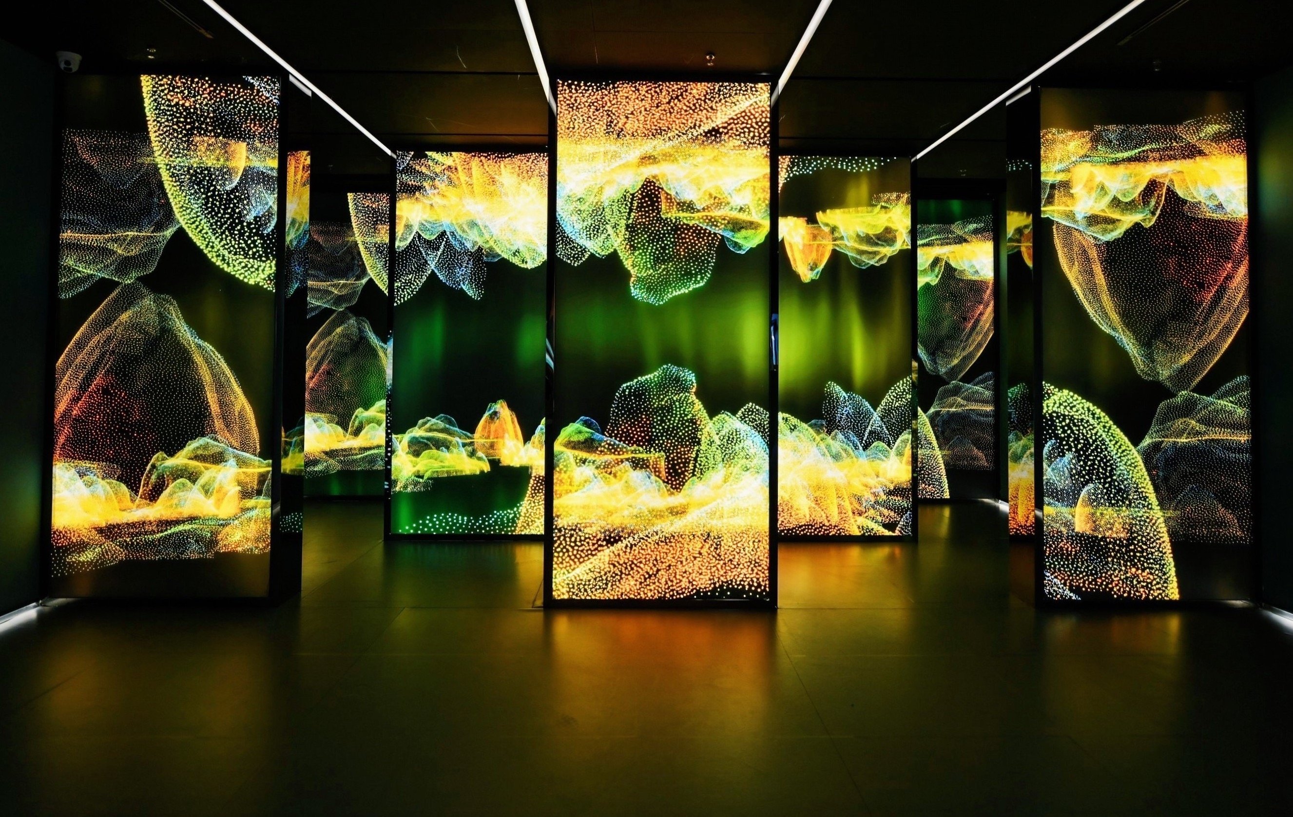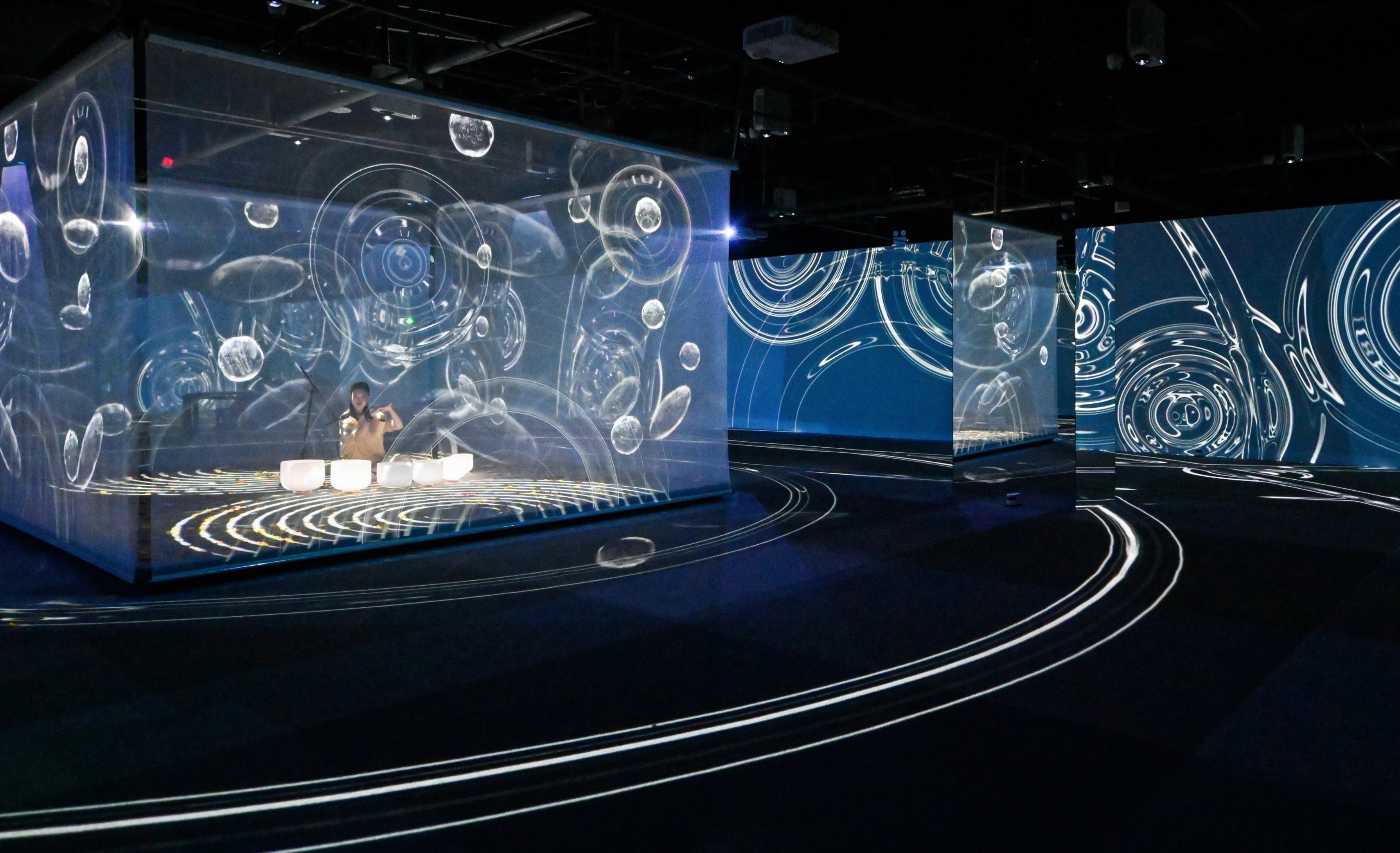 而在东大路站的C1或C2口脚步一转,眼前豁然开朗,幕墙上蓝、绿、黄交织形成的“山水画”带来些许科幻色彩,这就是由成都凤凰数字艺术中心东大路馆首展的《画游千里江山——故宫沉浸艺术展》。