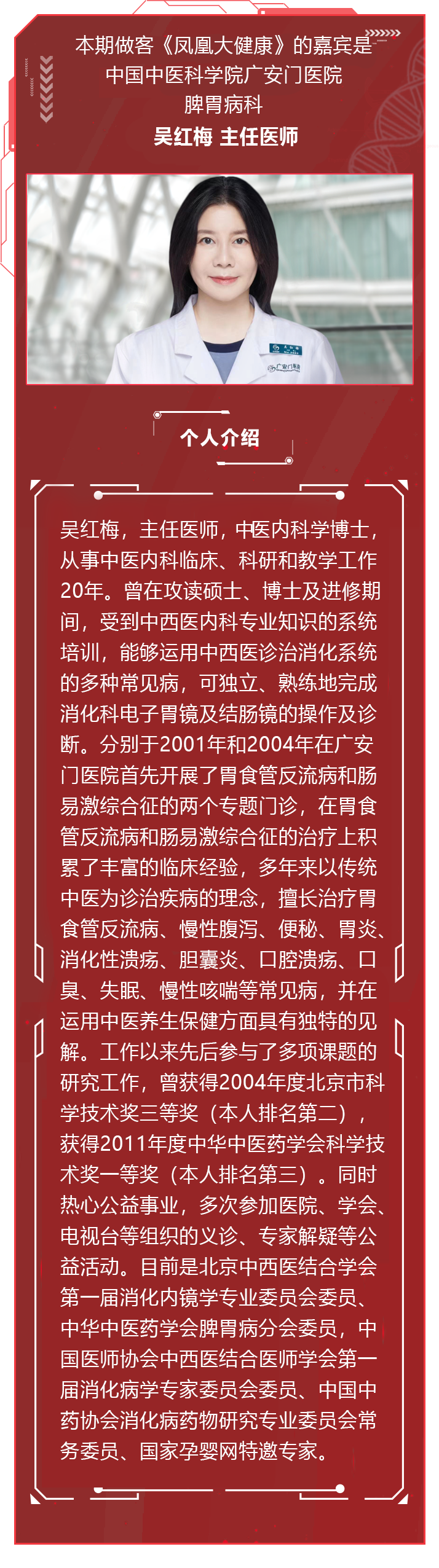 本期做客《凤凰大健康》的嘉宾是广安门医院脾胃病科吴红梅,哈佛大学医学院神经内科Brad Dickerson,天坛医院头痛科王永刚