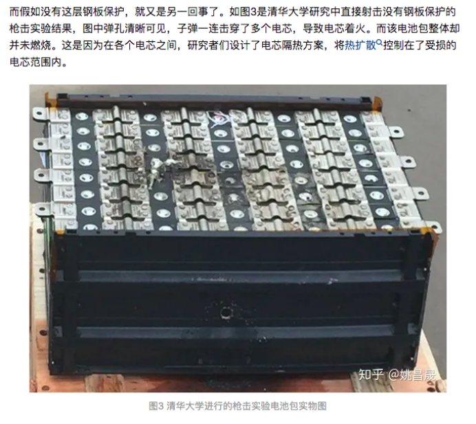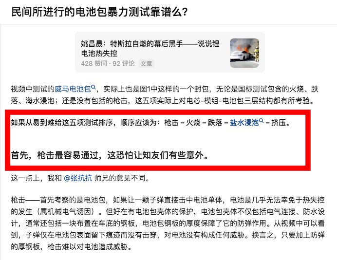 在《民间所进行的电池包暴力测试靠谱么?》这个话题下,清华博士姚昌晟也进行了回答。而且,他一语惊人:“如果从易到难给这五项测试排序,顺序应该为:枪击-火烧-跌落-盐水浸泡-挤压。首先,枪击最容易通过,这恐怕让知友们有些意外。”