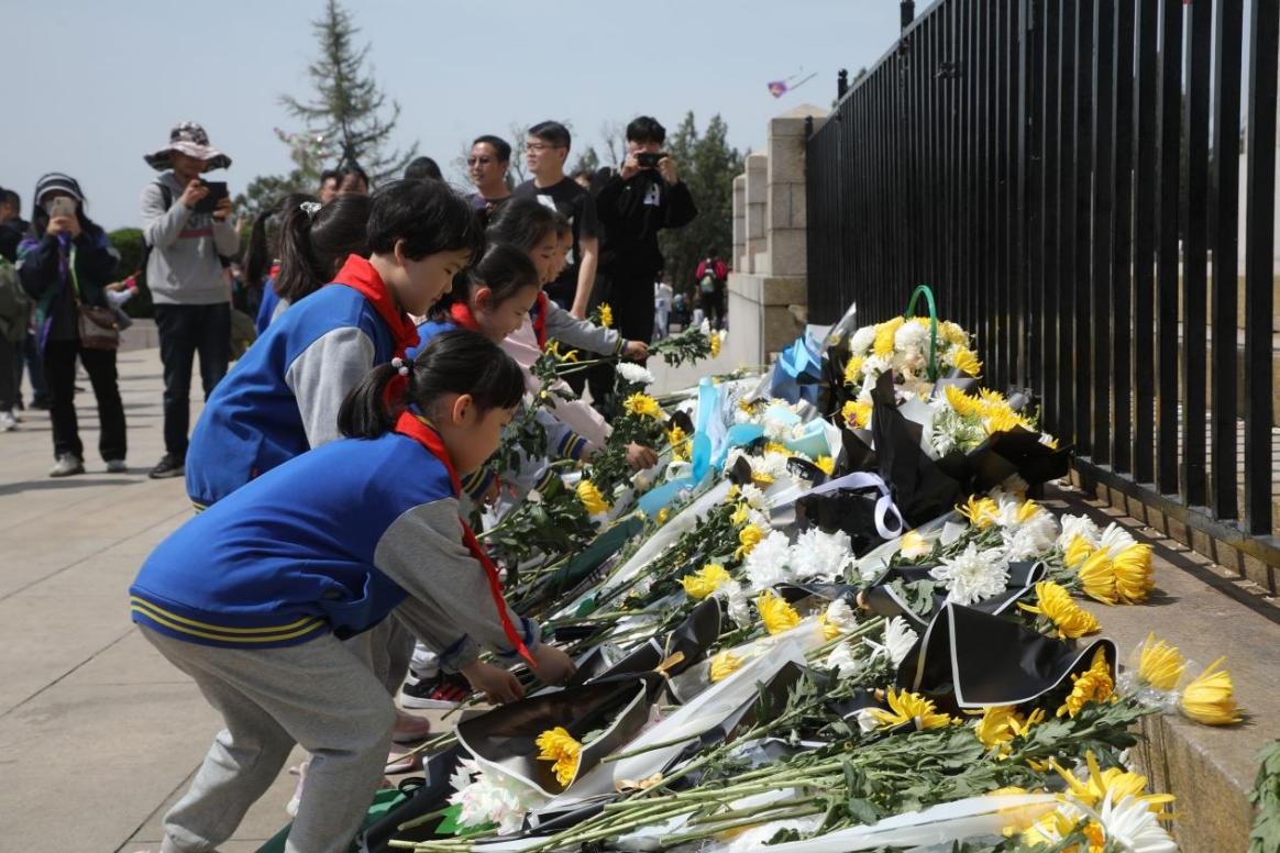 同学们手持鲜花,依次登上纪念碑前的台阶合影留念,向纪念碑敬献鲜花并环绕纪念碑参观,深切缅怀为中华民族独立和解放、为新中国建设和发展英勇献身的英雄烈士们
