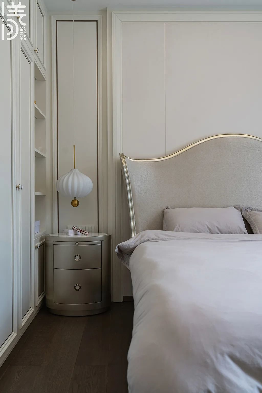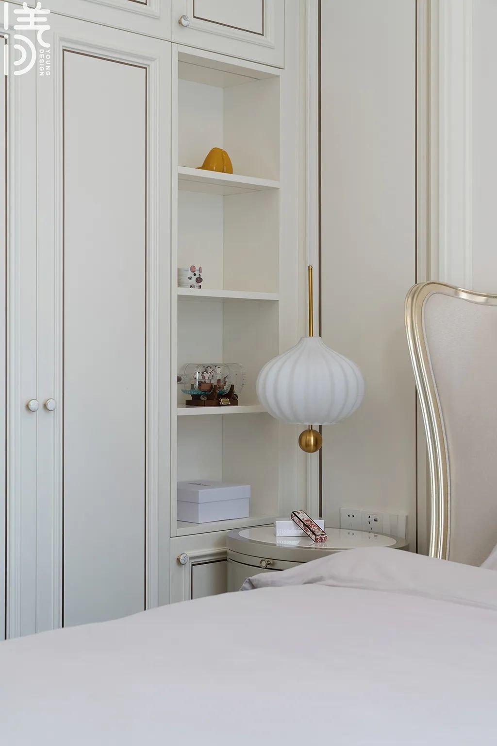 ▲床头侧边加装了开放格的衣柜,用于存放书籍和摆饰品,并给卧室增添精致和温馨的感觉。